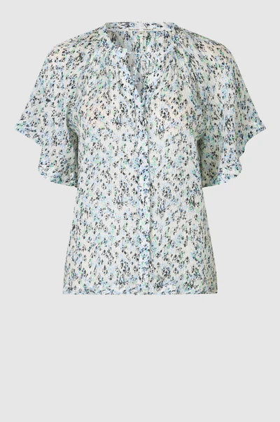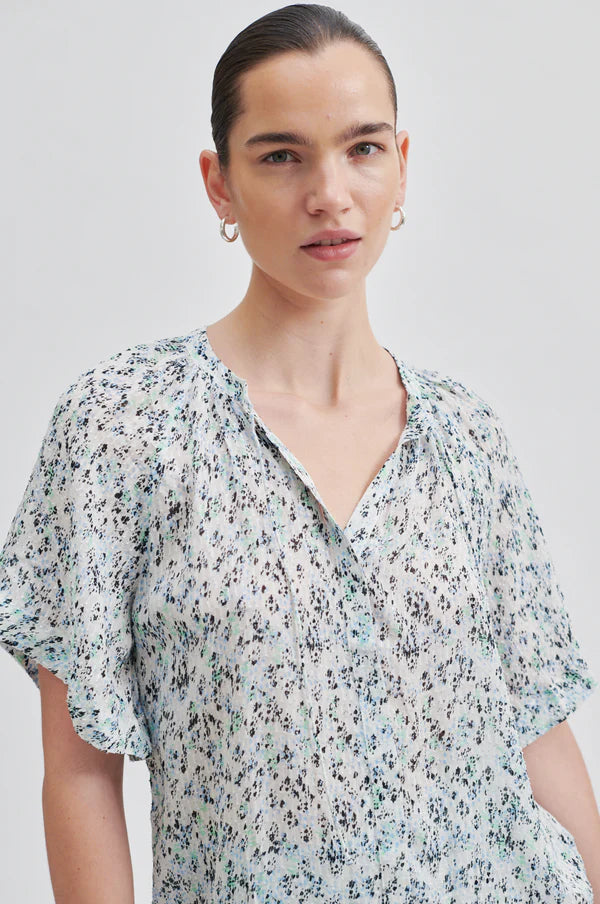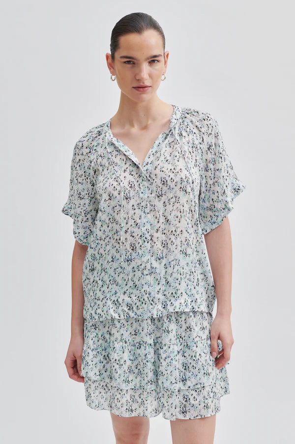 Second Female short-sleeved shirt with pattern. Made in light and airy viscose with slight texture and all-over pattern. Featuring a placket with concealed button fastening at the front with tie fastening at the top of the neck. Short raglan sleeves with slightly flared silhouette. Relaxed fit.