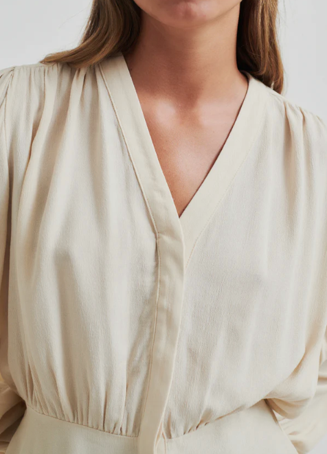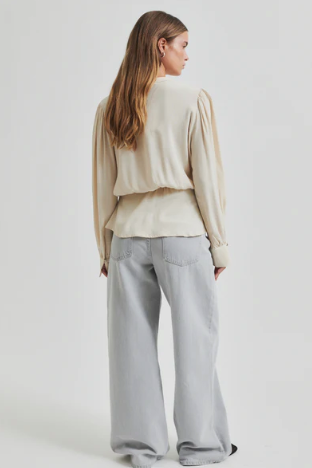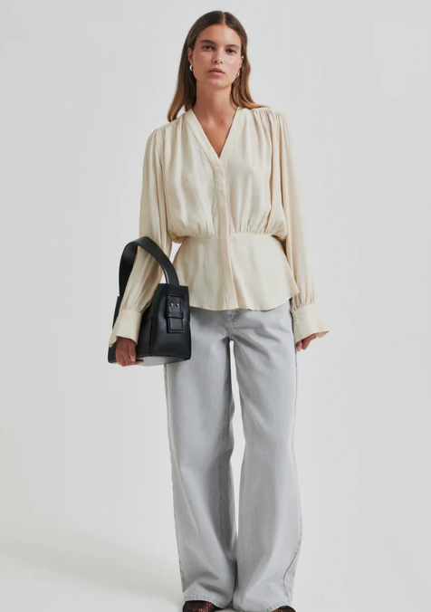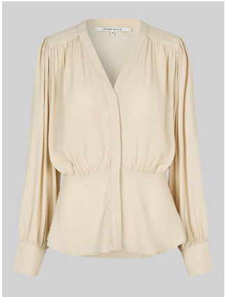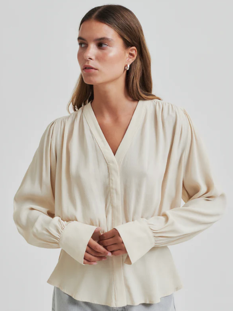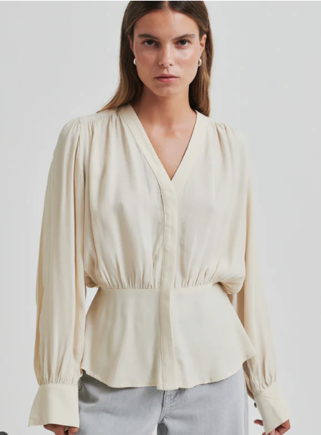 Second Female shirt with gathers. The shirt is made in light and drapy viscose. Featuring a V-neckline with concealed button fastening. Elasticated section at back of waist. Gathered details at shoulders, waist and cuffs. Decorative silver button at cuffs. Relaxed fit at top with fitted waist with slight peplum effect.
