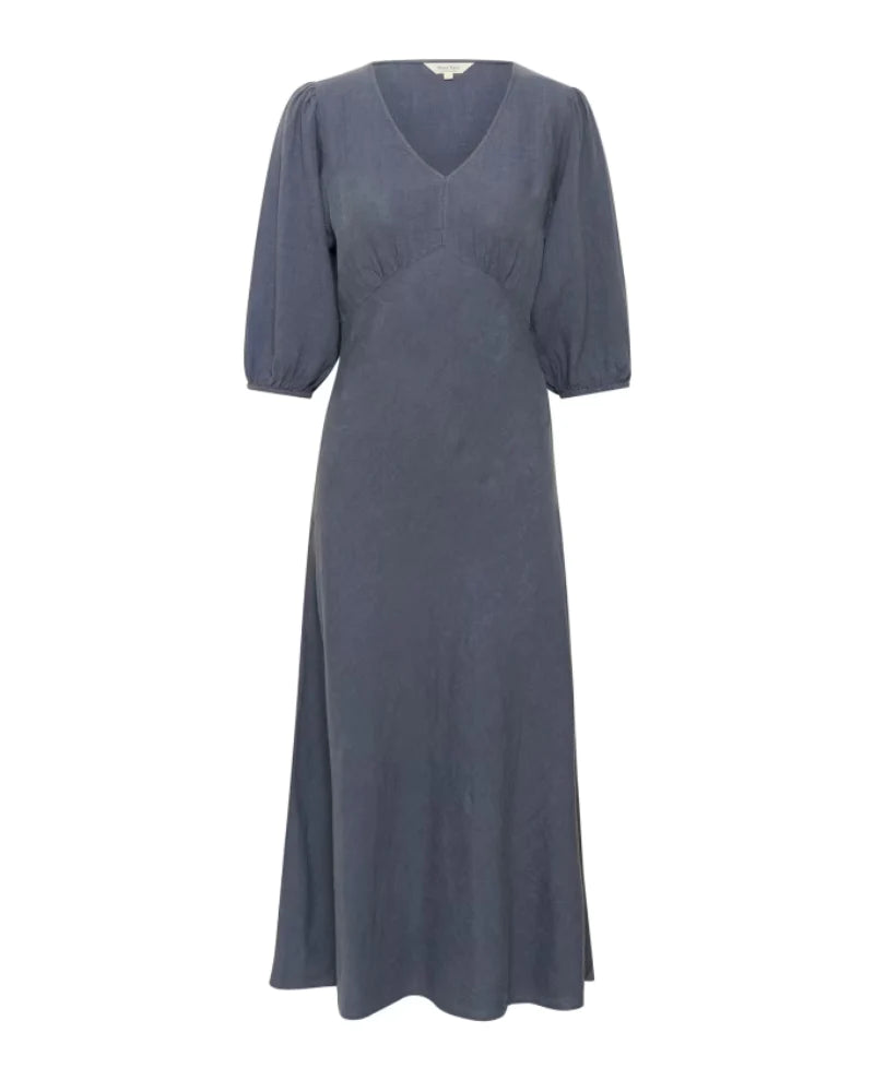 - Soft V-neckline, half-length blouson sleeves, elasticated cuffs, fitted through the waist, gathered under bust detailing, flared skirt, midi length, smooth finish
