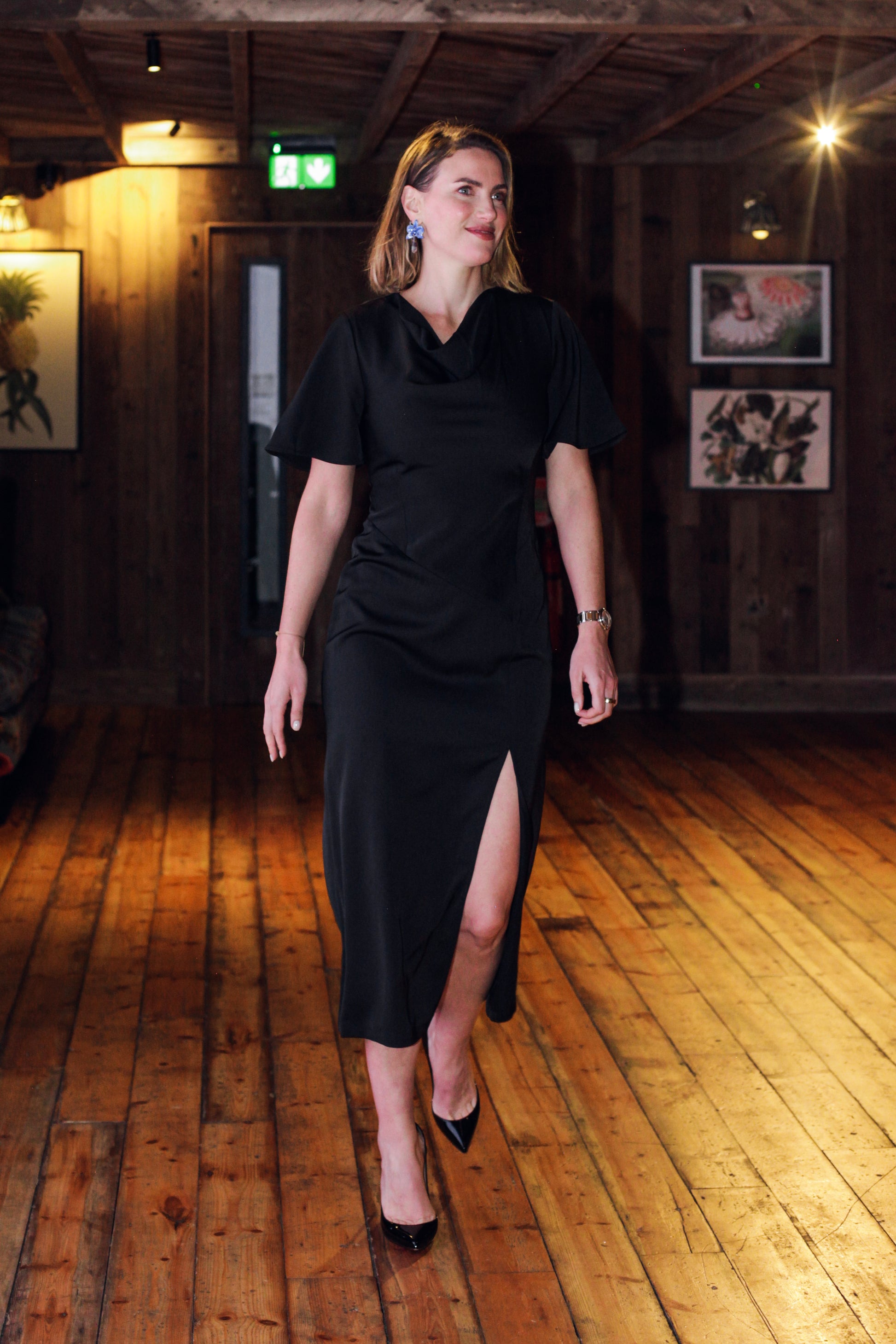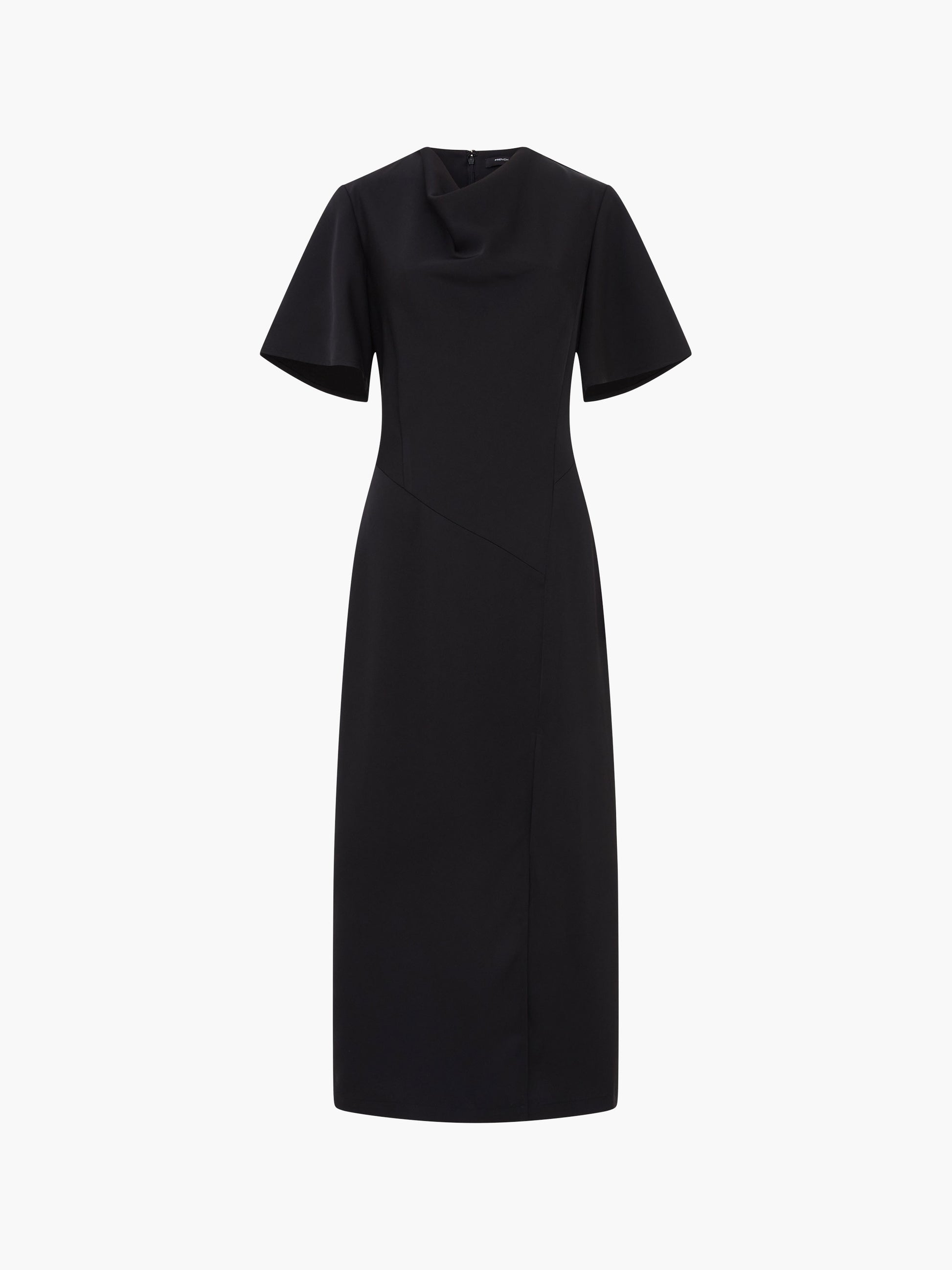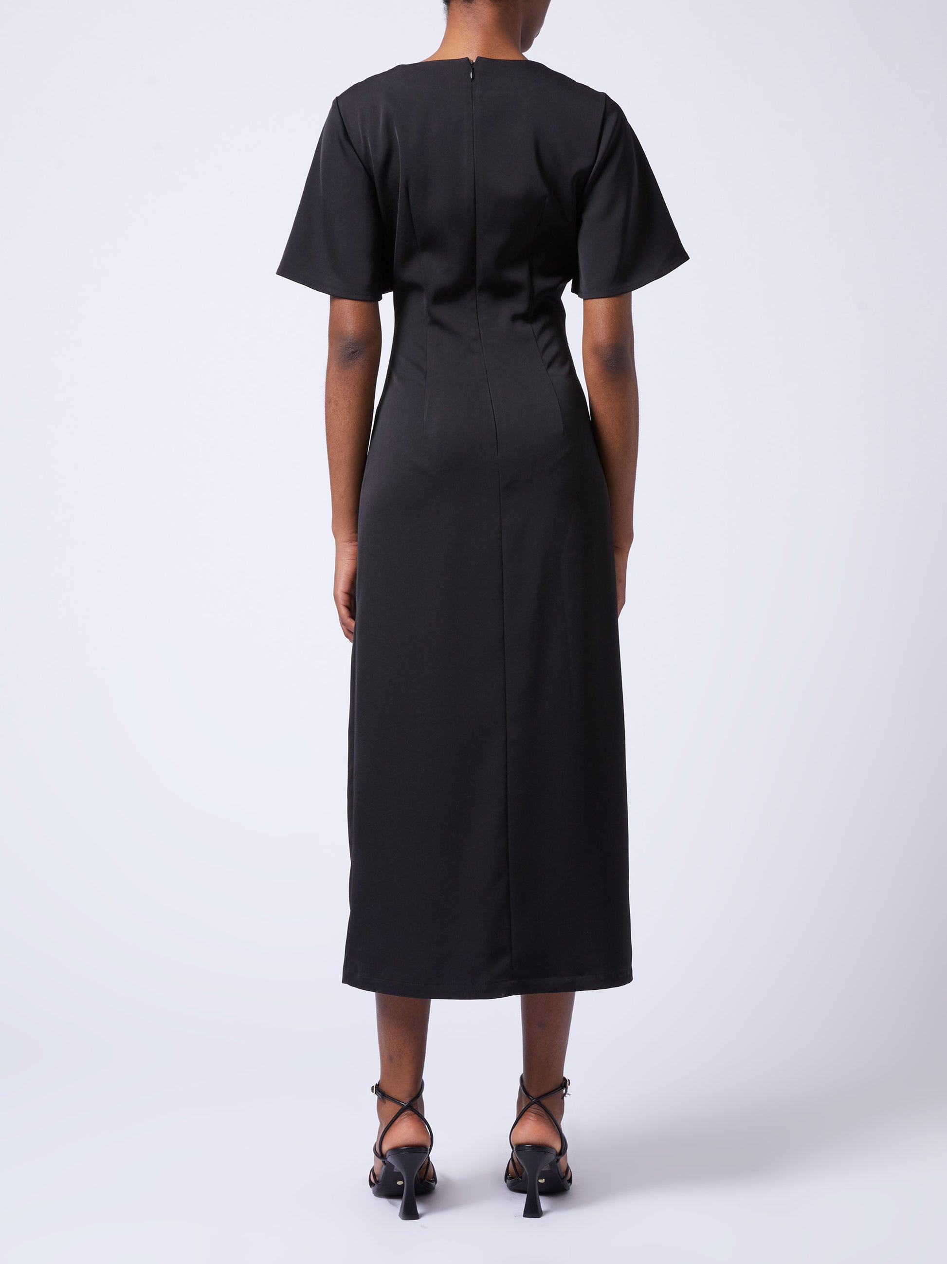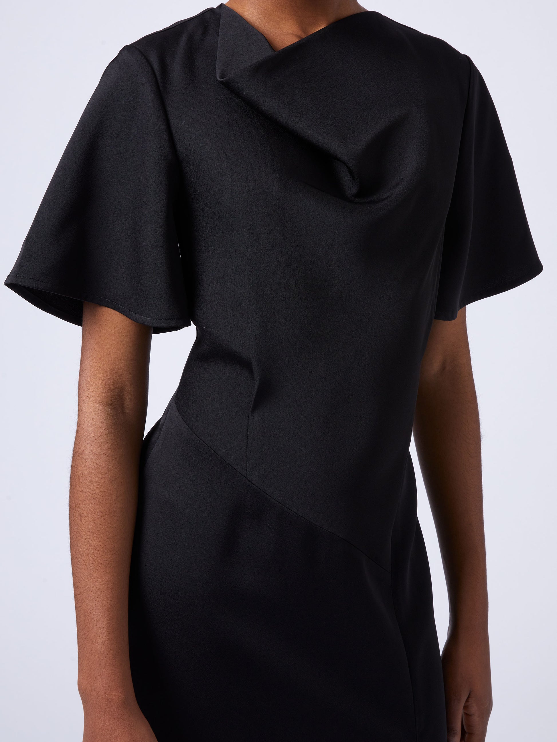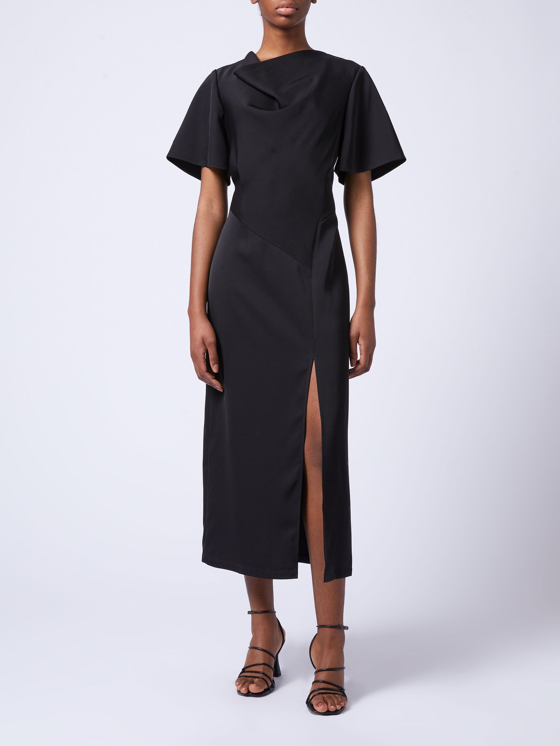 Our Fenix Satin Dress is a tres chic addition to your black dress collection. This timeless satin style updates a simply sophisticated silhouette by framing with short flare sleeves and a playful cowl neckline whilst featuring asymmetric style line detailing and falling to a single side split.