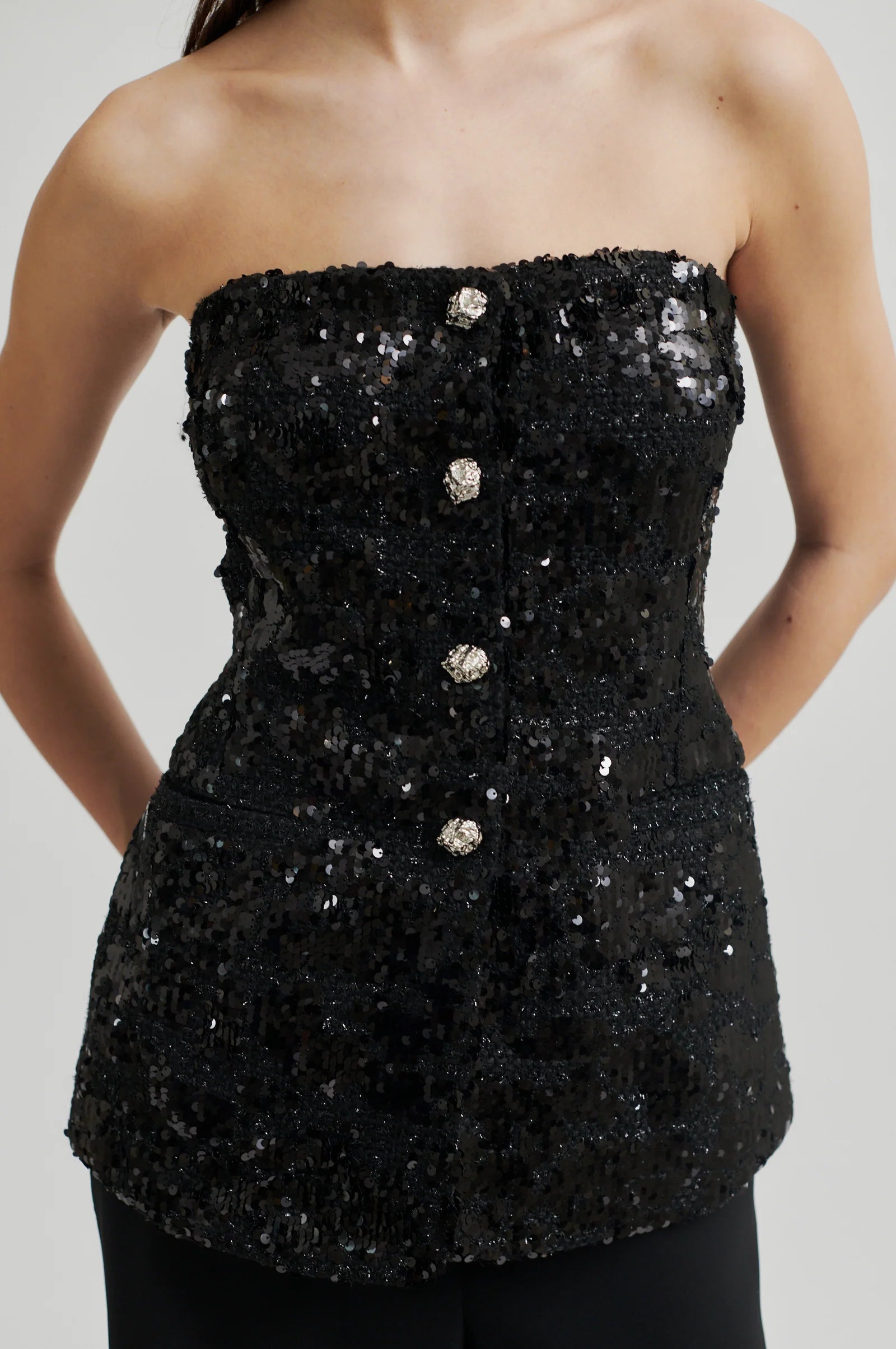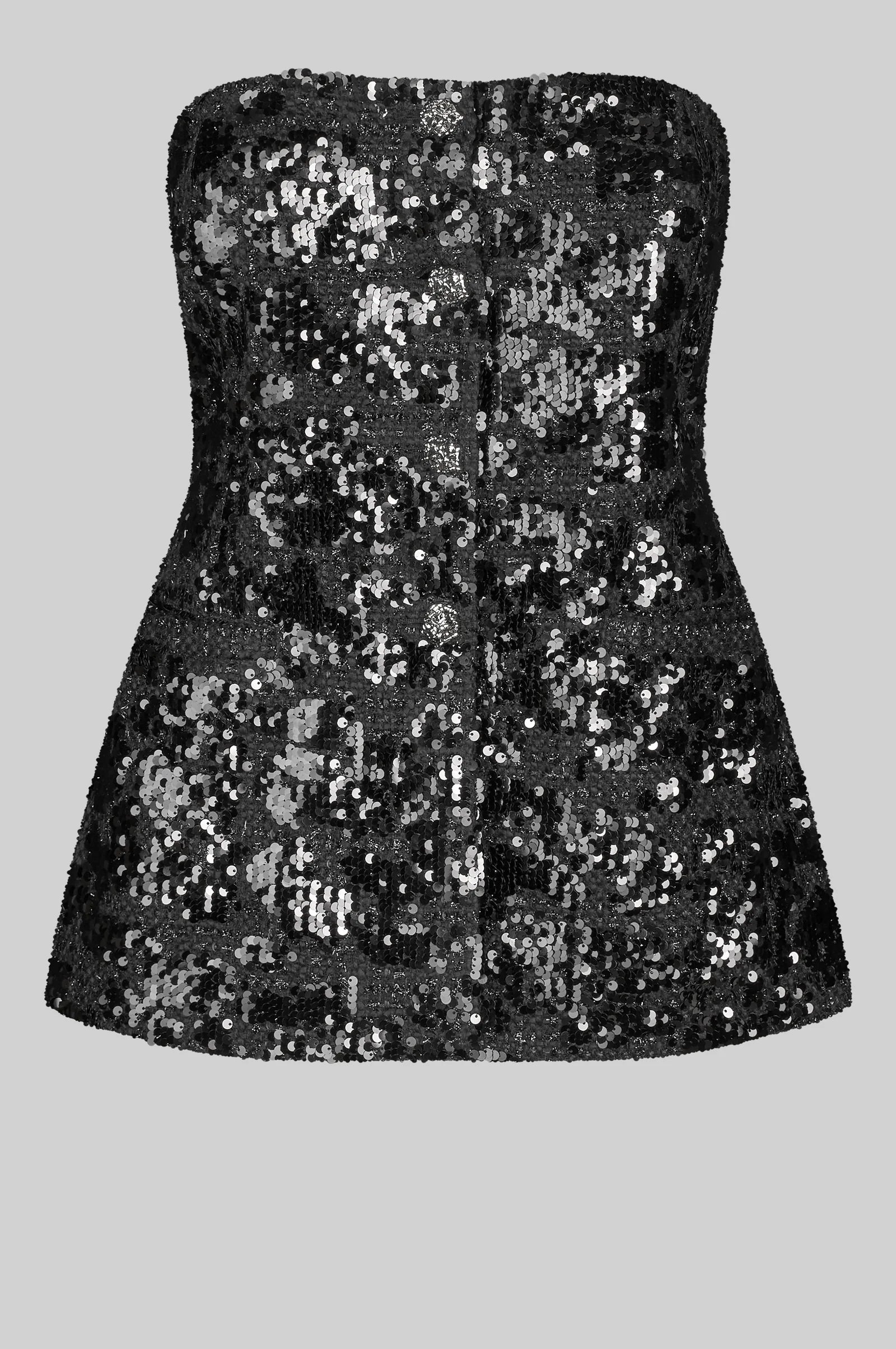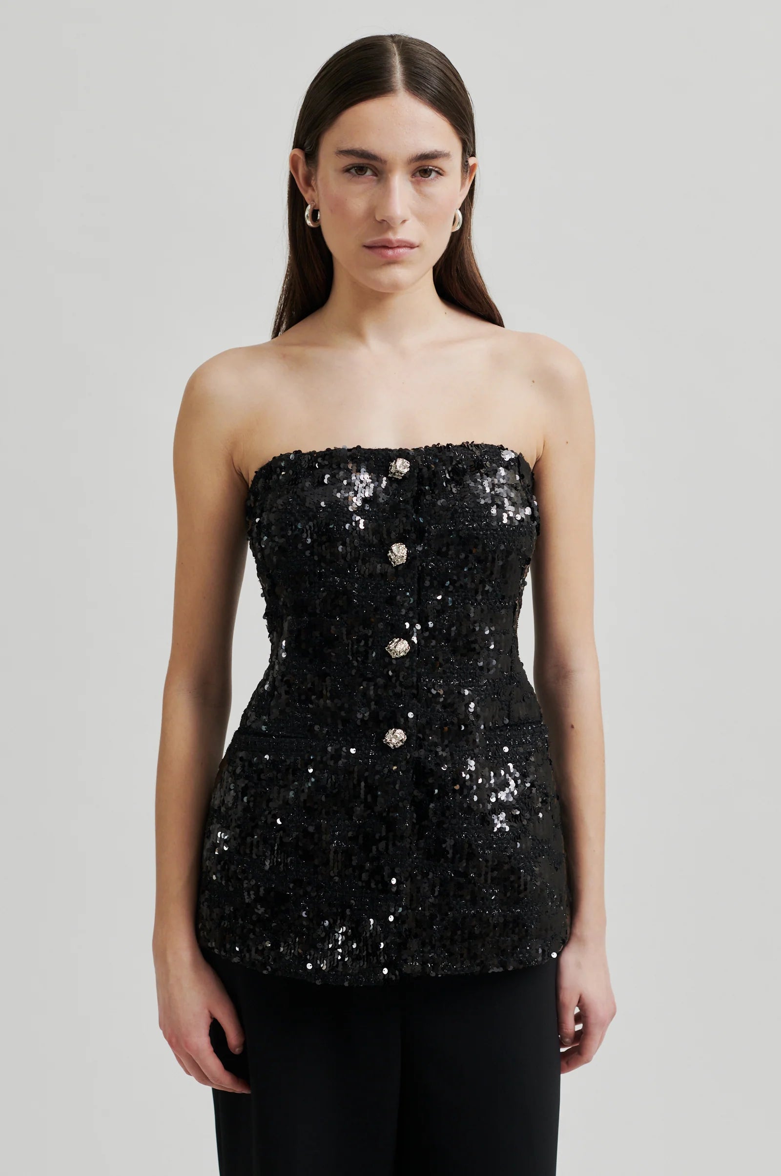 Second Female sequin bouclé top. The top is made in a textured fabric with bouclé effect and tonal sequins. Featuring an elasticated section at the back and two concealed pockets at the front. Fully lined. Fitted shape that follows the body's contours.