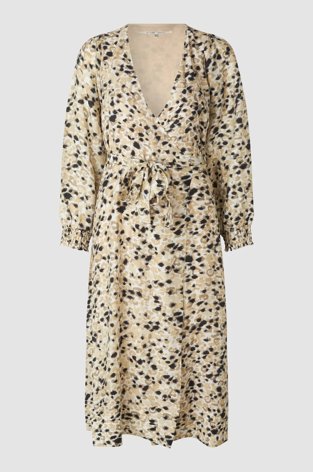 Second Female monochrome wrap dress. Made in light and semi-sheer tencel blend with all-over print. Featuring a V-neckline and crossover neckline that wraps around and fastens at one side with fabric ties. Slight gathers at shoulders and long sleeves with elasticated cuffs. Lined body and unlined sleeves. Regular fit with flowing, airy skirt.