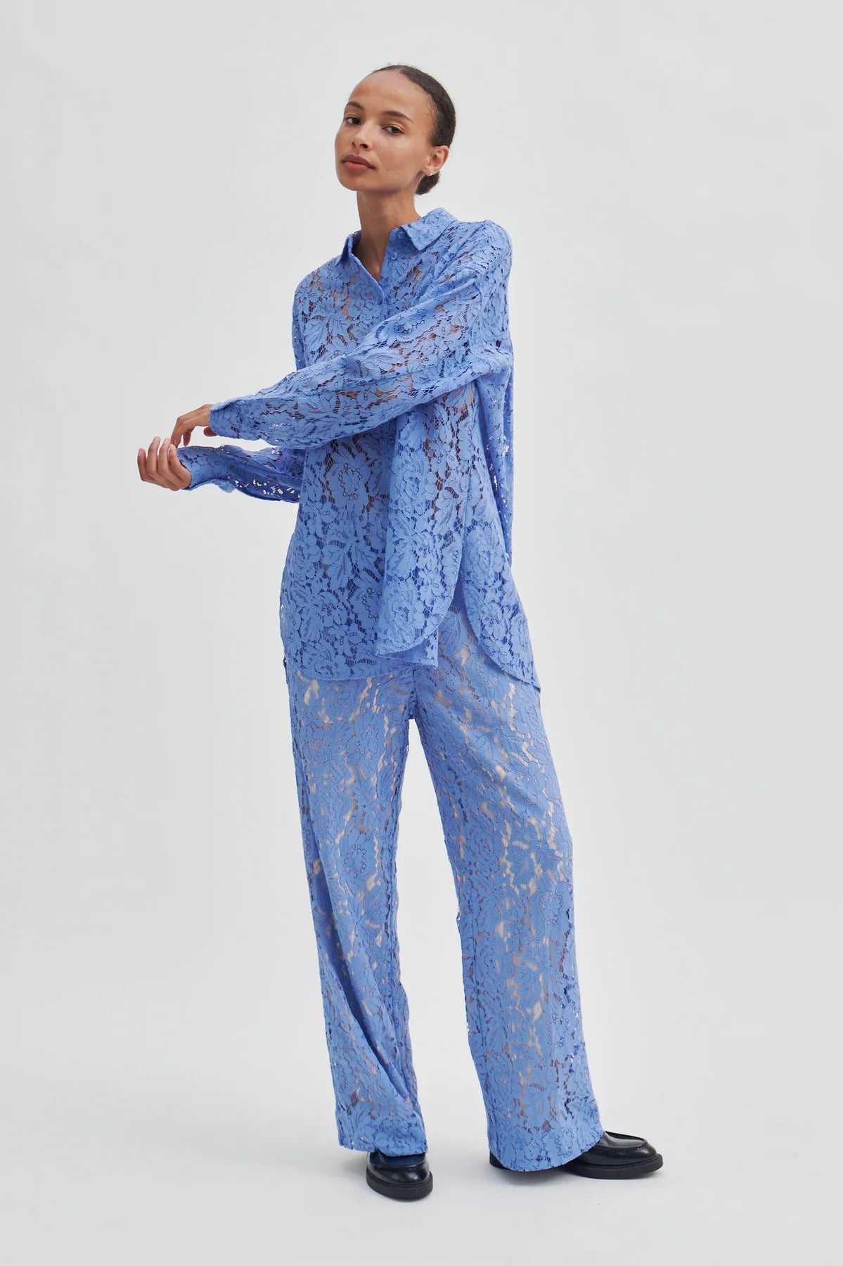 Second Female lace trousers. Made in a cotton floral lace fabric with contrast viscose lining. Featuring a concealed zip closure at the front with hooks and button inside waistband. Two slant pockets at the front and two decorative jetted pockets at the back. Mid waist with straight leg.