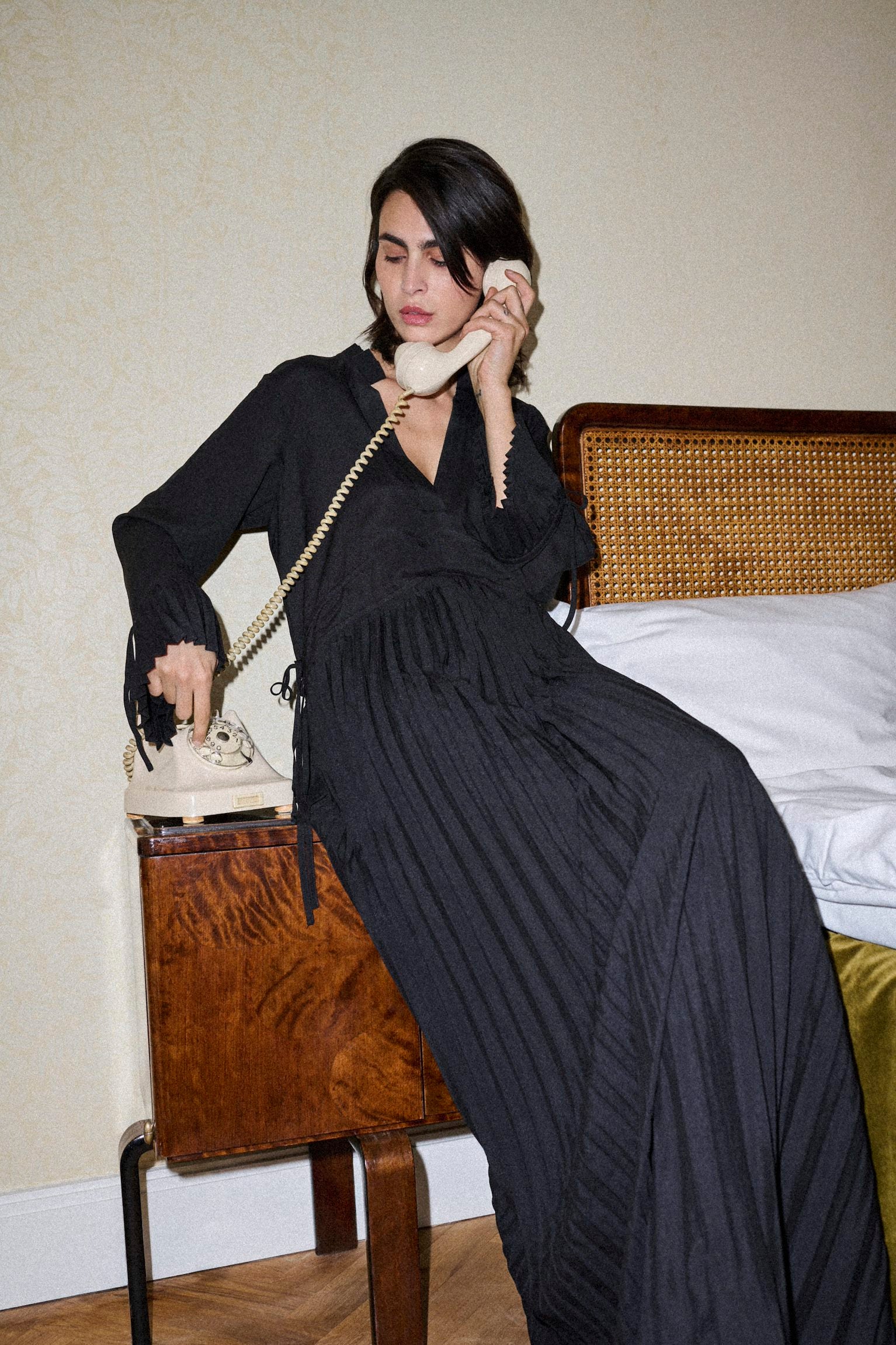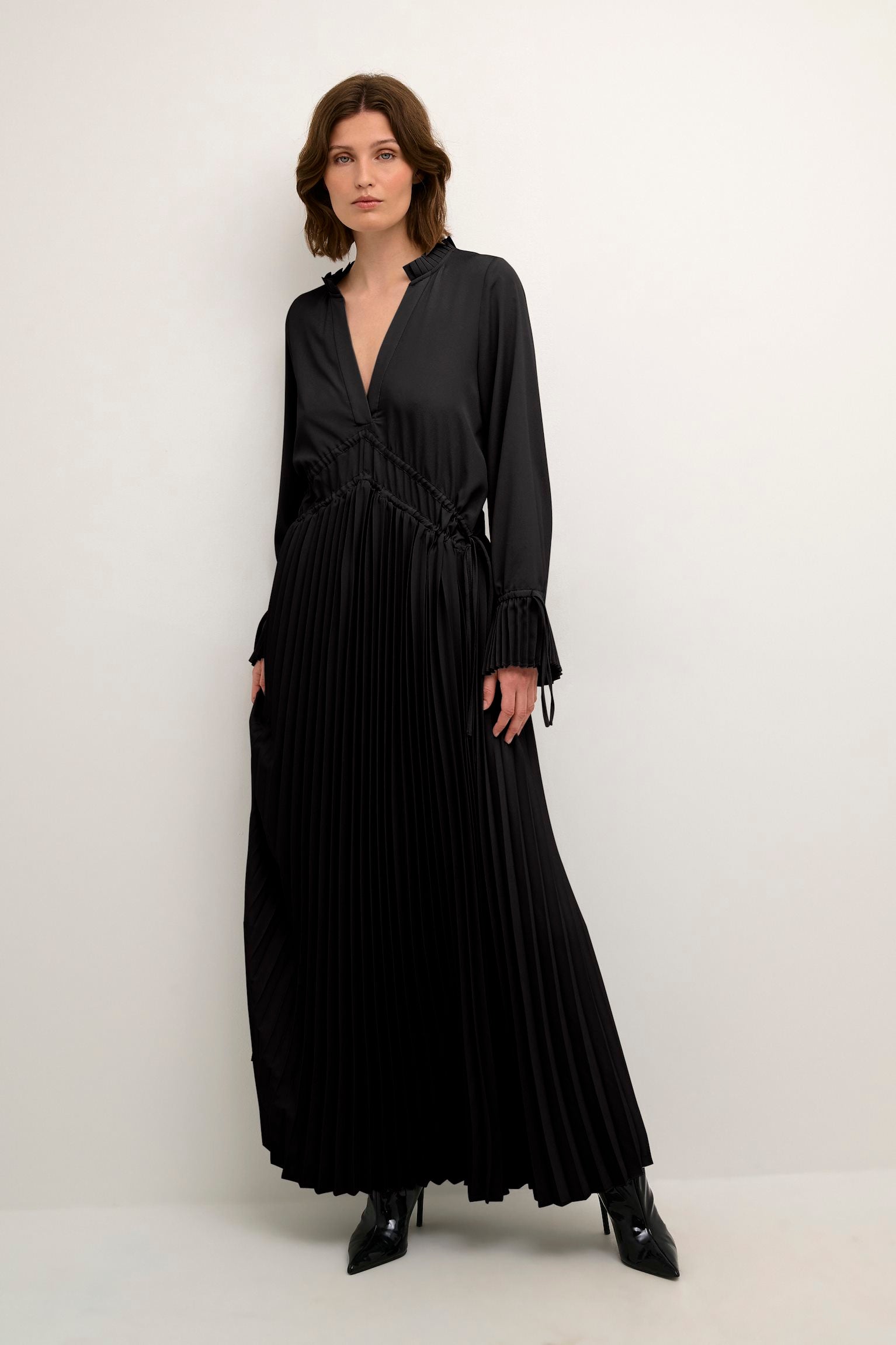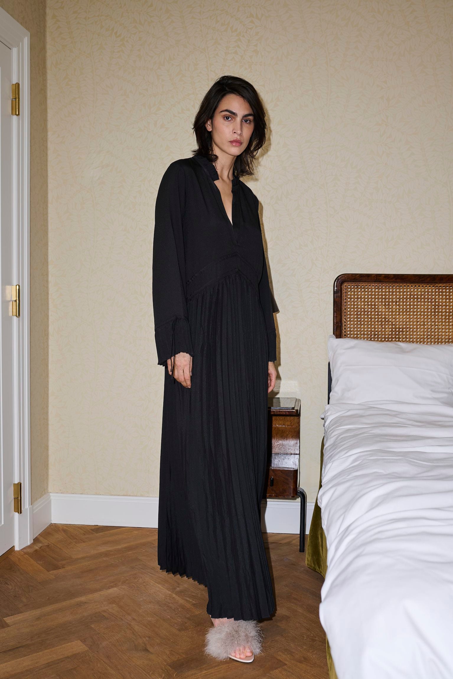 The model is 176 cm and wearing size 36/S. Maxi dress with deep V-notch neckline and frilled mandarin collar. The dress has a peaked waistline with two sets of drawstrings, that allows you to adjust the silhouette. The skirt of the dress has an A-line fit and is made in an accordion pleated fabric. The sleeves are long and straight with a loose fit, and they have a pleated cuff with adjustable drawstrings at the wrists.