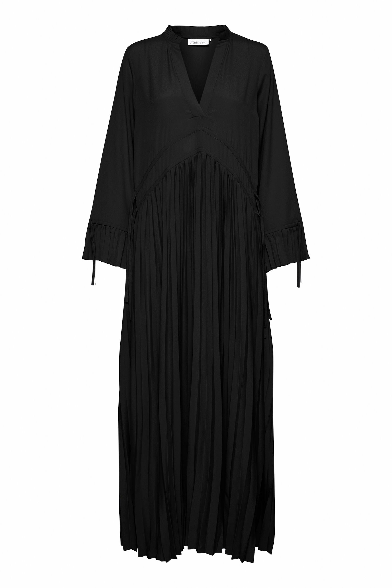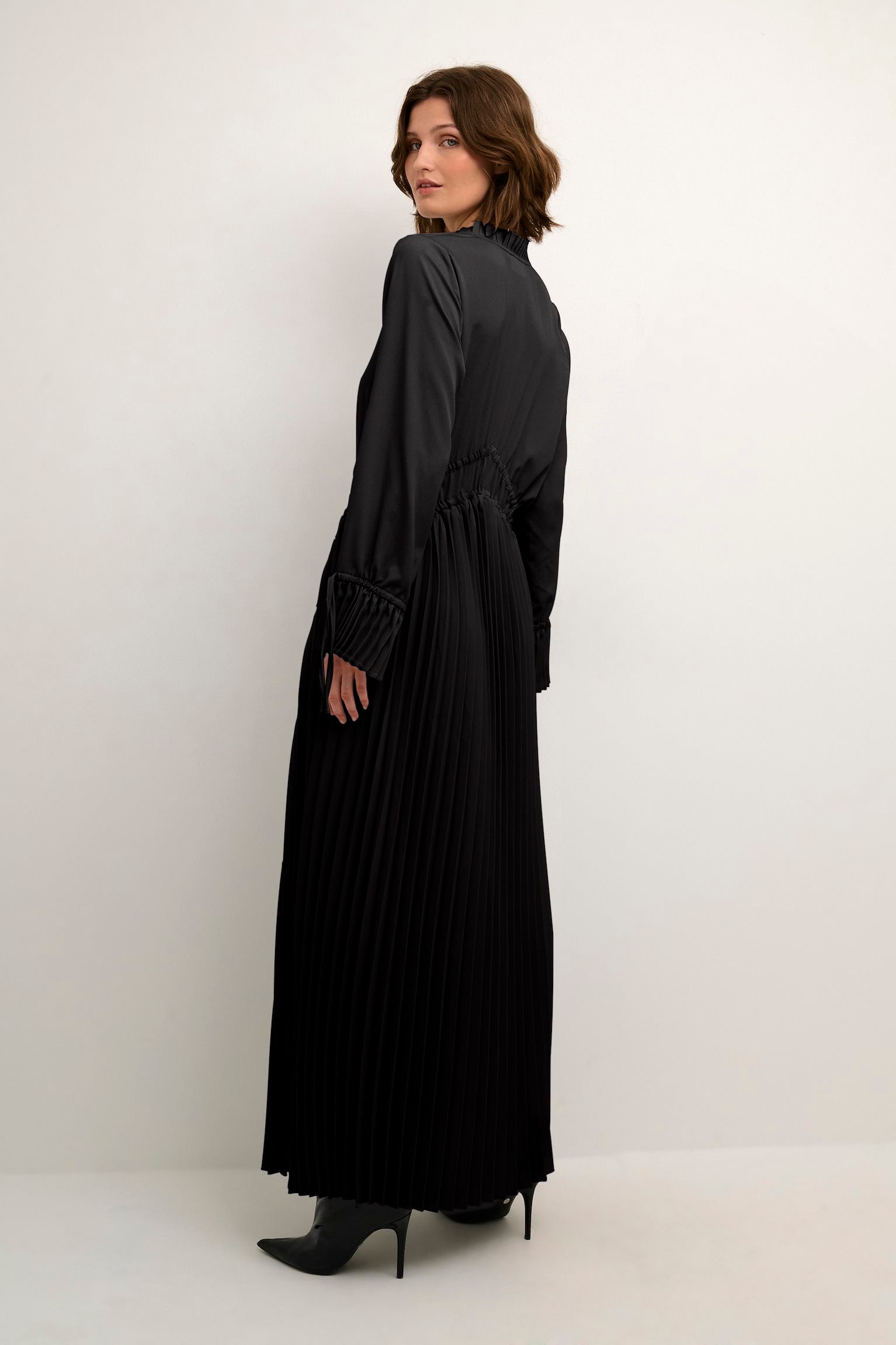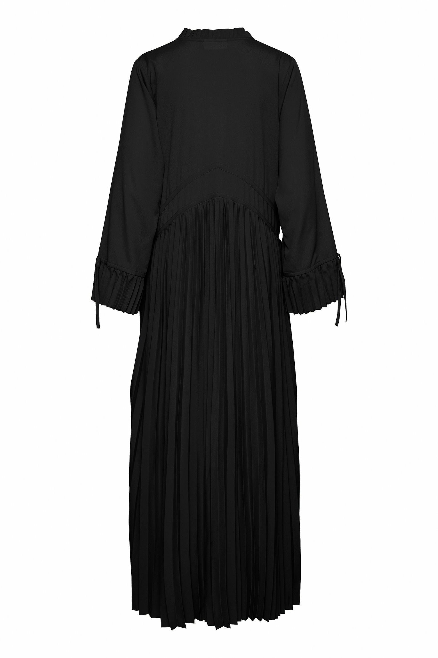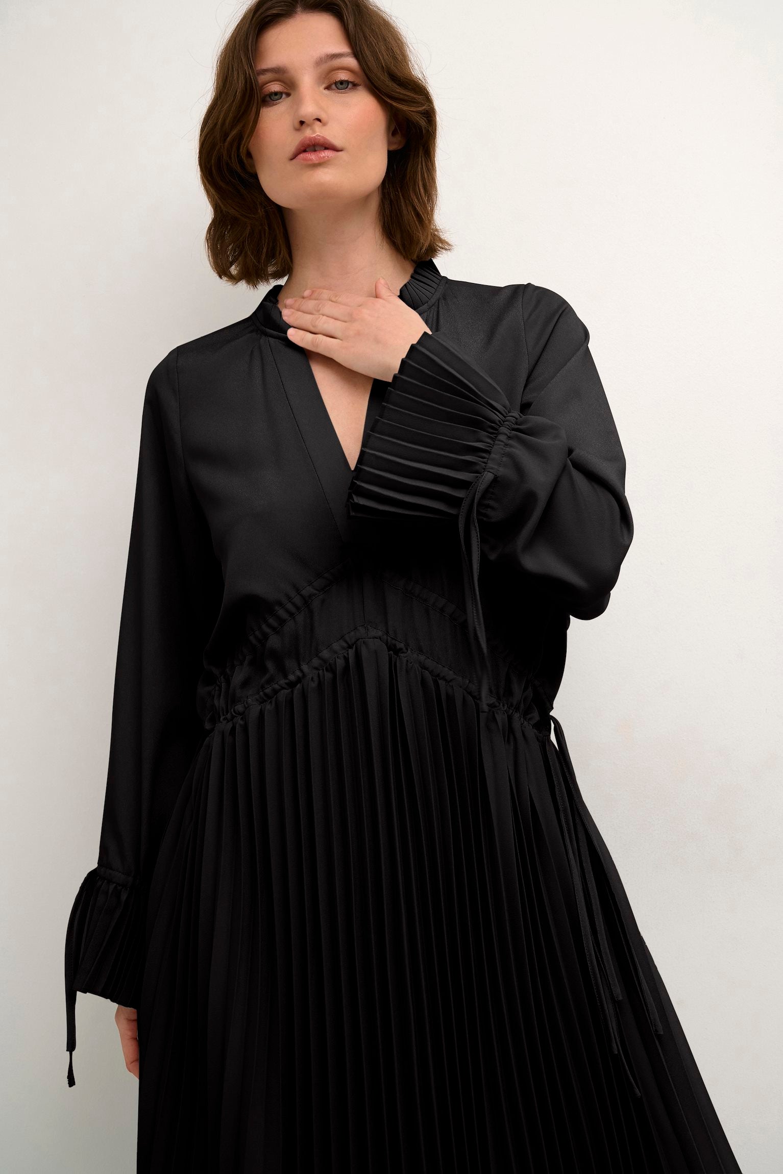 The model is 176 cm and wearing size 36/S. Maxi dress with deep V-notch neckline and frilled mandarin collar. The dress has a peaked waistline with two sets of drawstrings, that allows you to adjust the silhouette. The skirt of the dress has an A-line fit and is made in an accordion pleated fabric. The sleeves are long and straight with a loose fit, and they have a pleated cuff with adjustable drawstrings at the wrists.