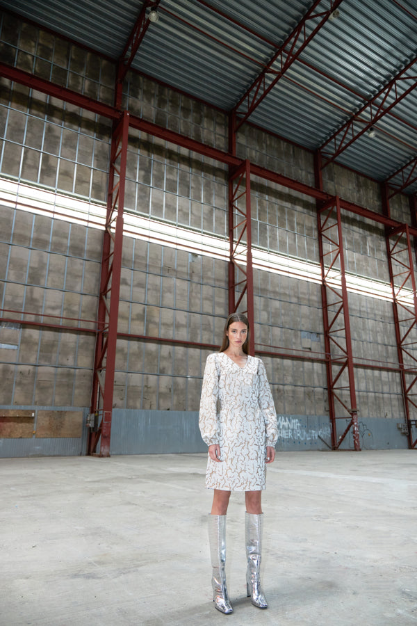 The model is 176 cm and wearing size 36/S. Short dress with long sleeves and a tailored silhouette. At the back it has an elastic waist, that emphasizes the figure. It has a V-neck, and it is cut above the knees. The sleeves are voluminous bishop sleeves, that are gathered in an elastic cuff. The dress is made in beautiful jacquard fabric.