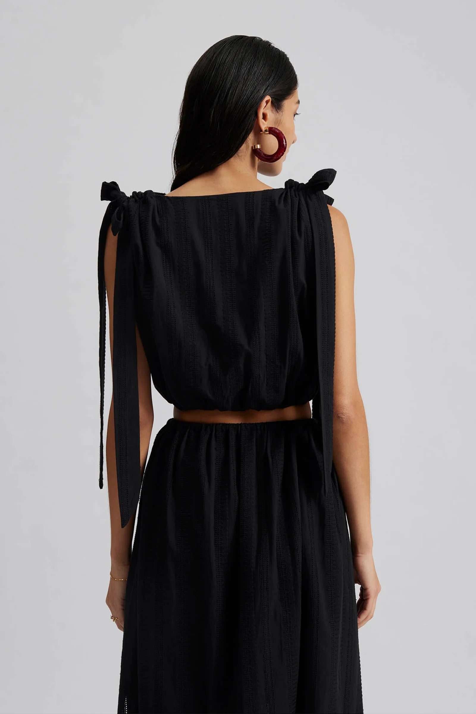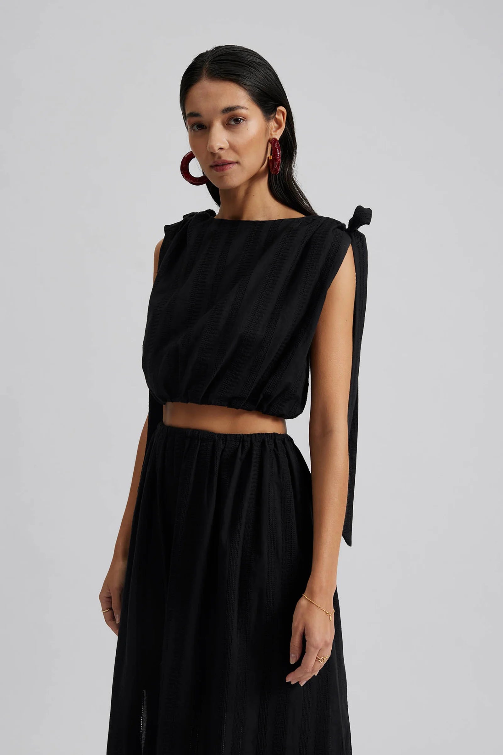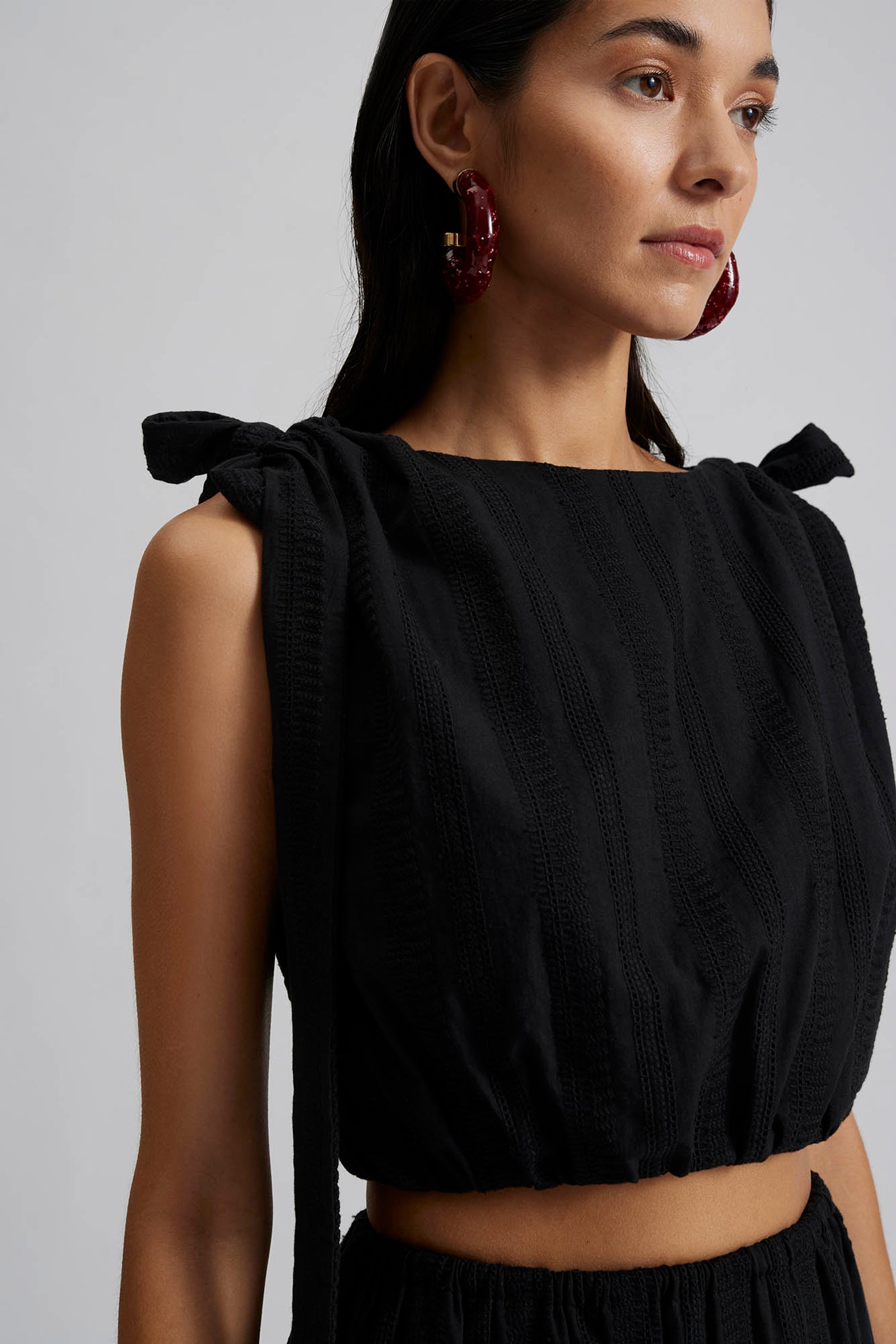Embroidered cropped top with rouch and tie details on the shoulders.