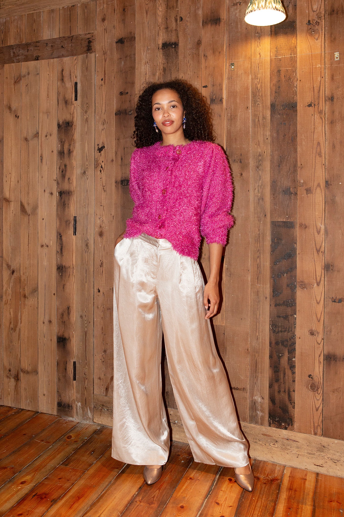 Glitter cardigan with hair and elastic cuffs. Kitty Cardigan has four Fabienne Chapot buttons that close to the neckline.