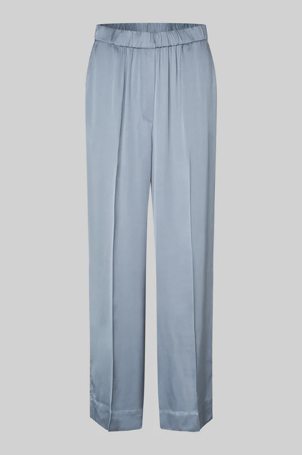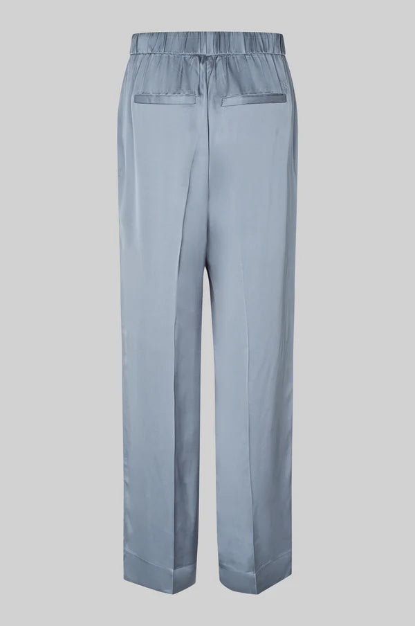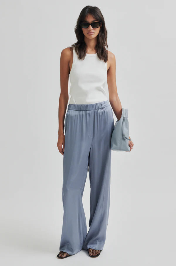 Second Female silky trousers. The trousers are made in a soft and drapy viscose with a lustrous quality. Featuring a covered elasticated waistband and decorative fly at the front. Two slanted pockets at the front and two decorative pockets at the back. Regular waist with straight, wide leg