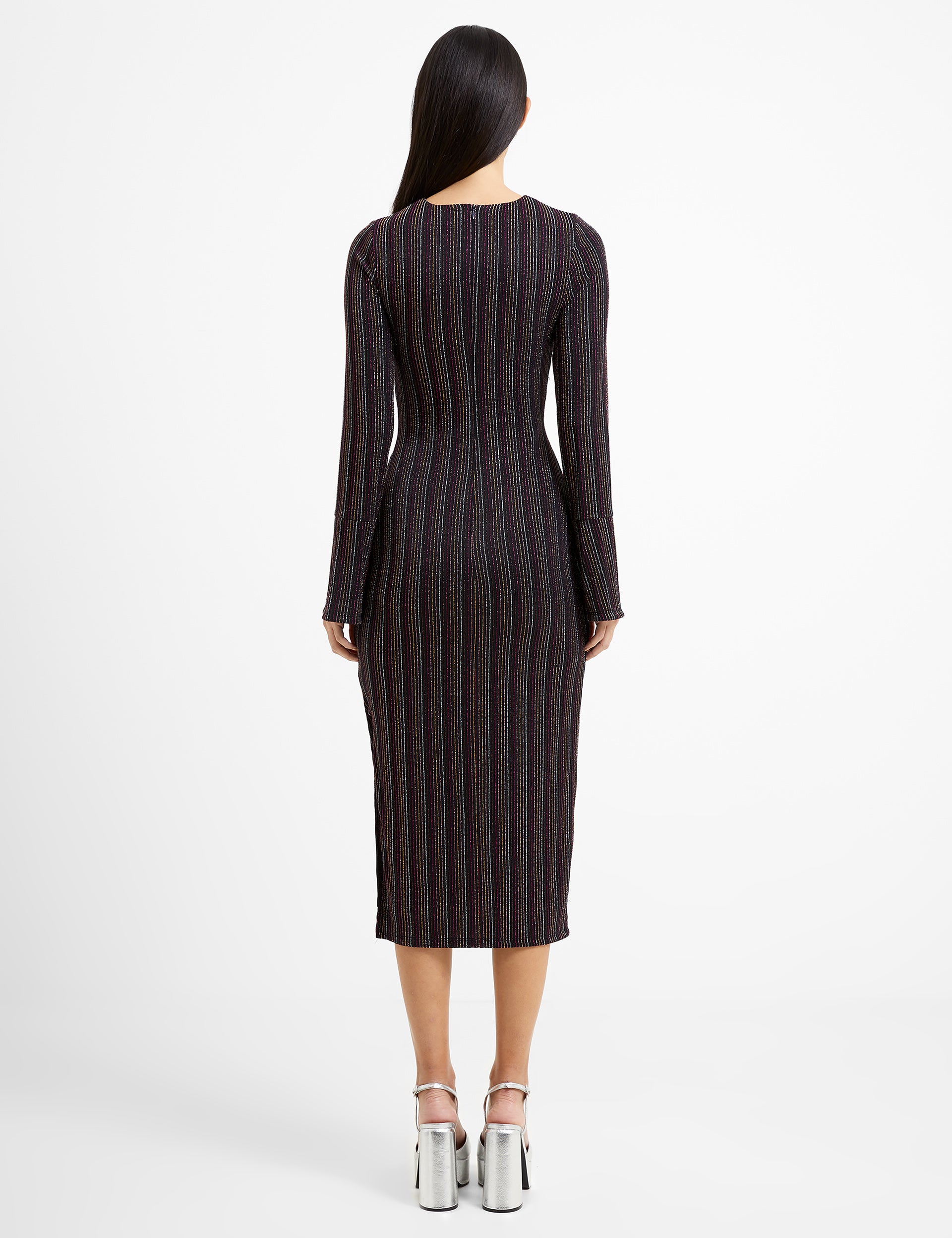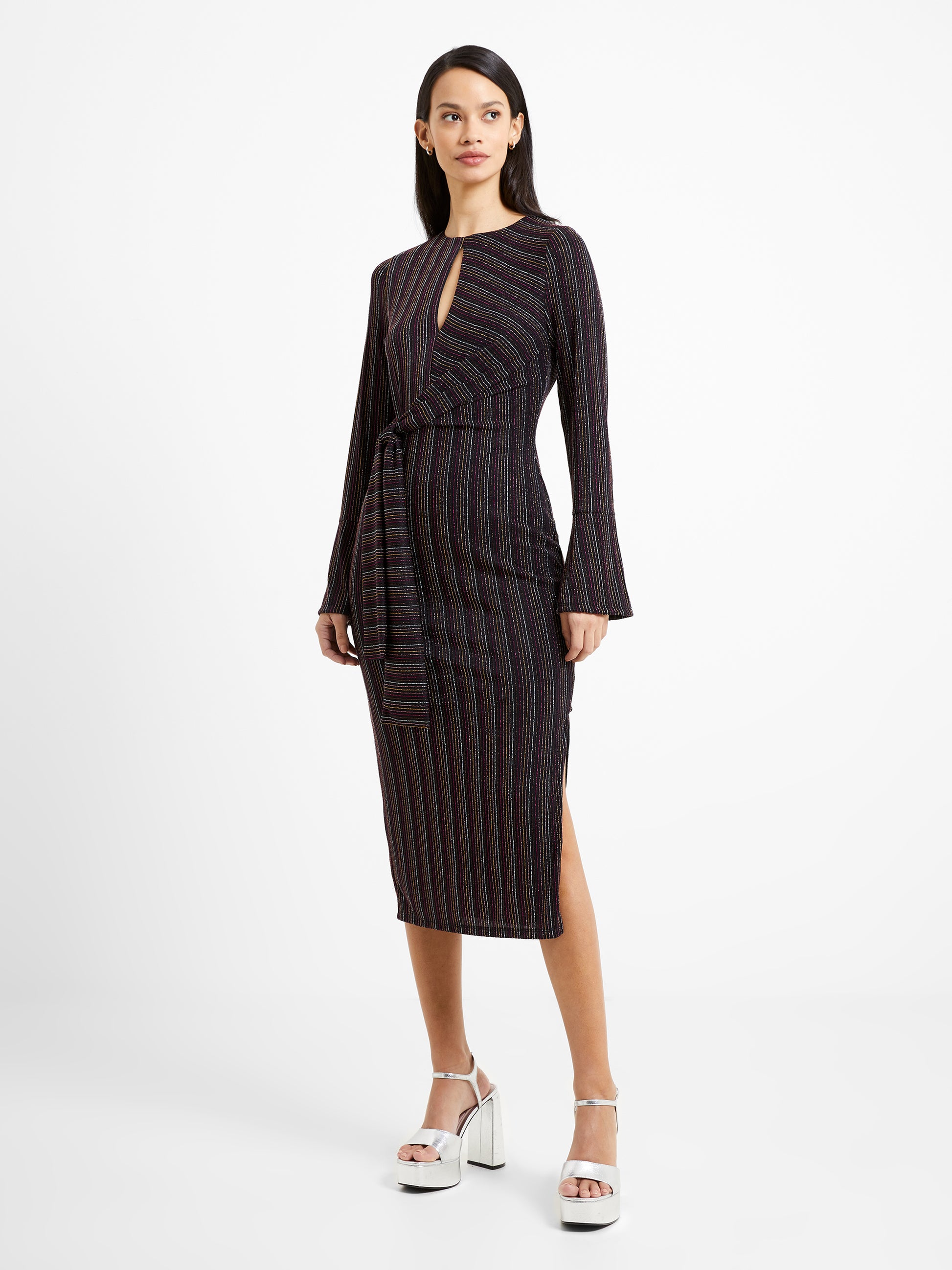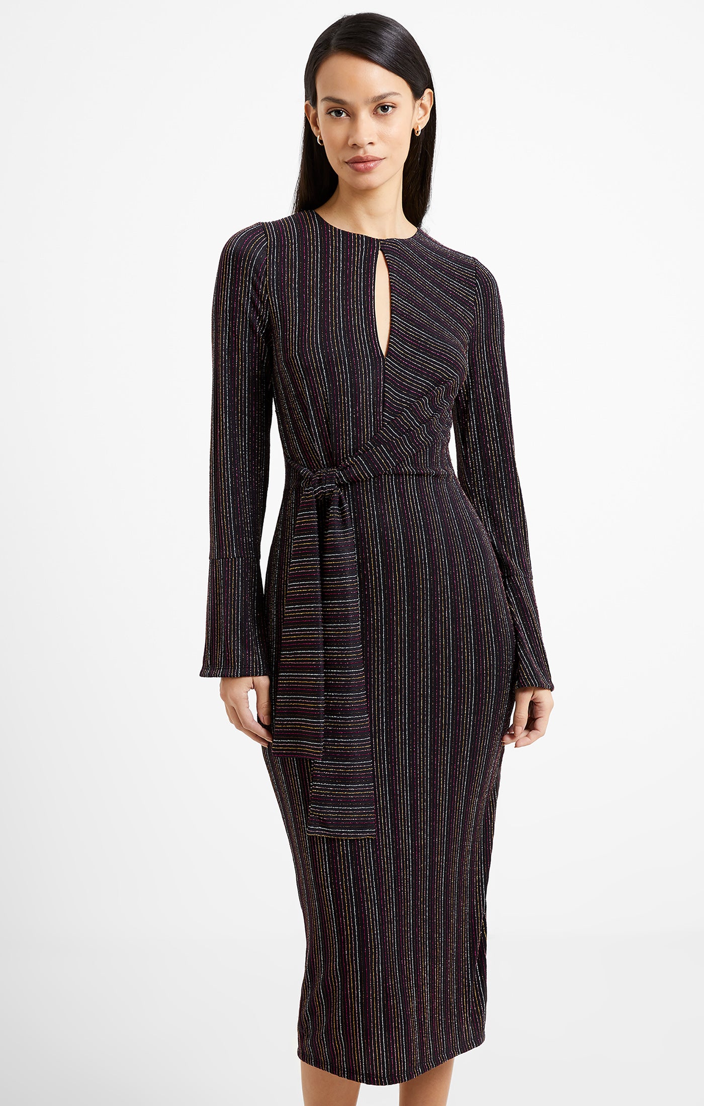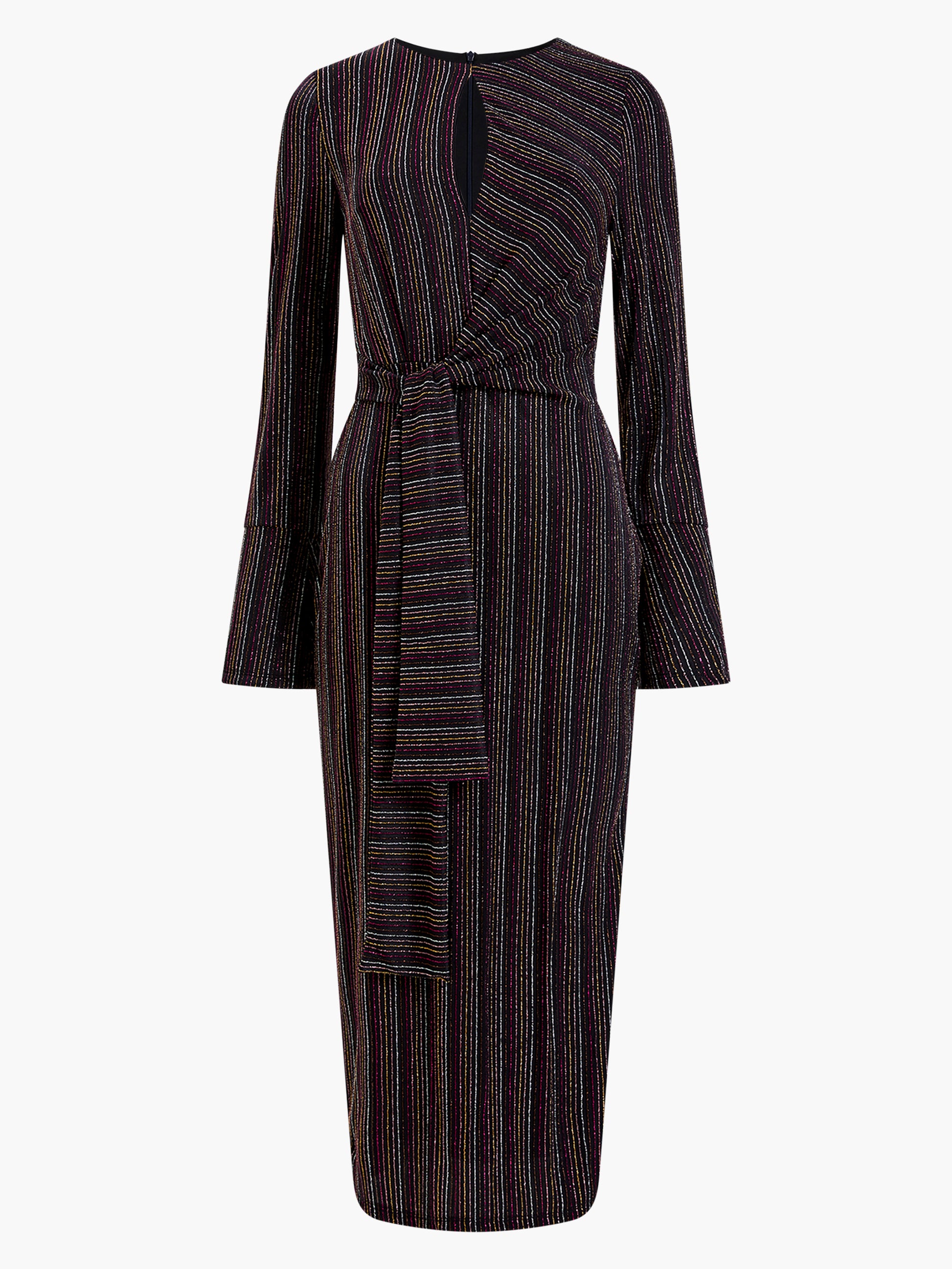 A playful metallic pattern and flirty keyhole makes our Paula Keyhole Maxi Dress a sought-after style. This full-length dress is a wonder from its round neckline to itssultry side split skirt with glittering lurex stripes showcasing a flattering self-tie belt whilst flared cuffs add a retro finishing touch.