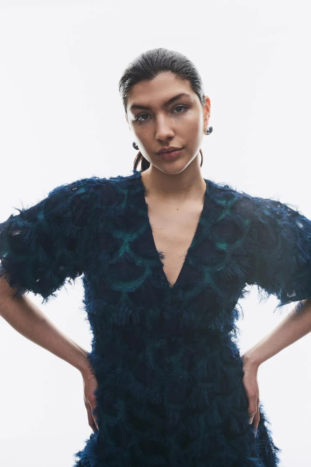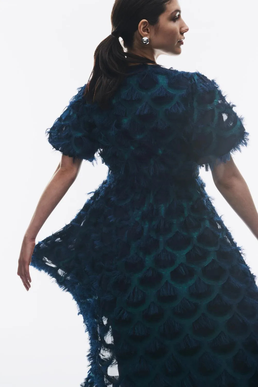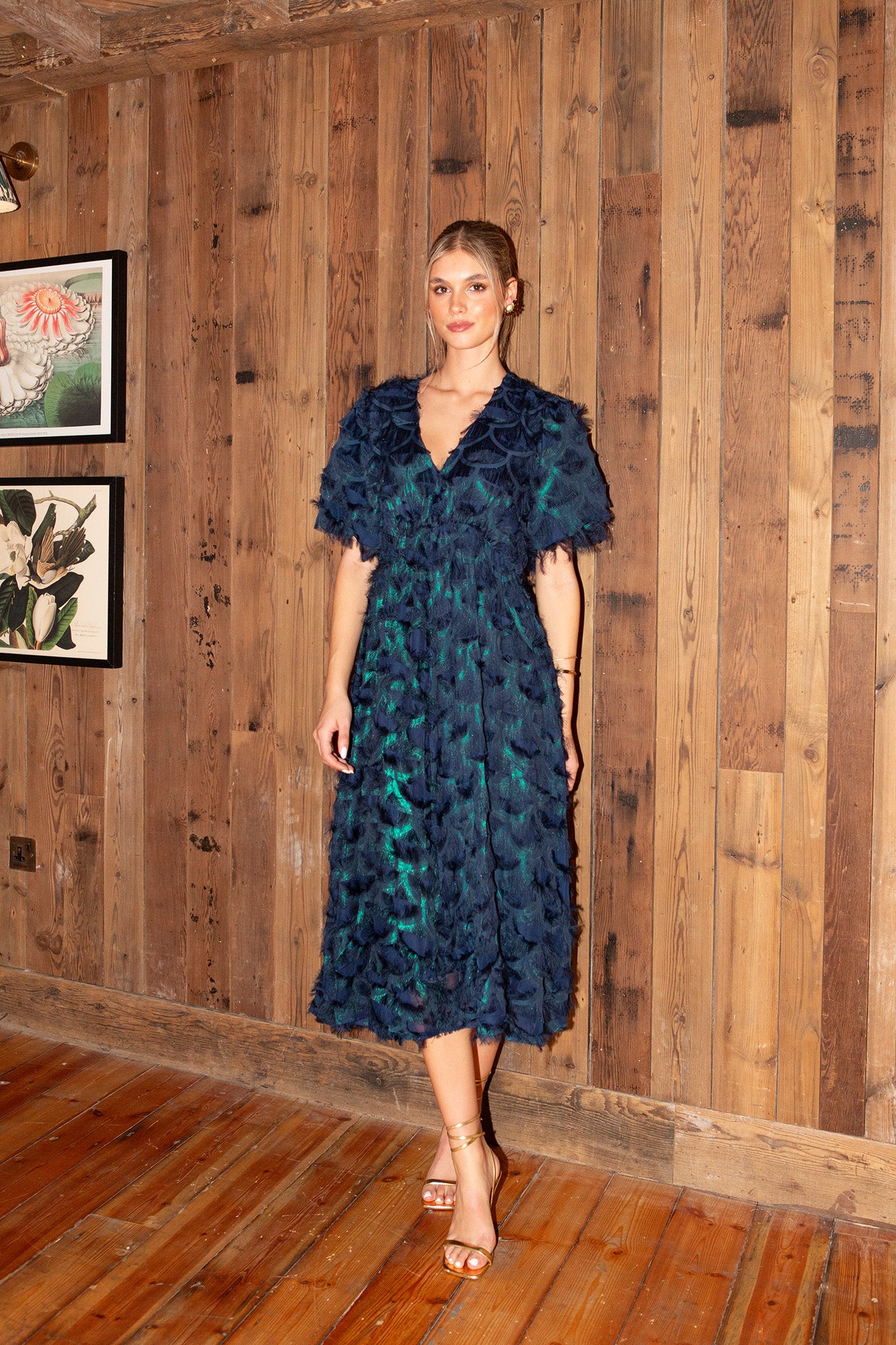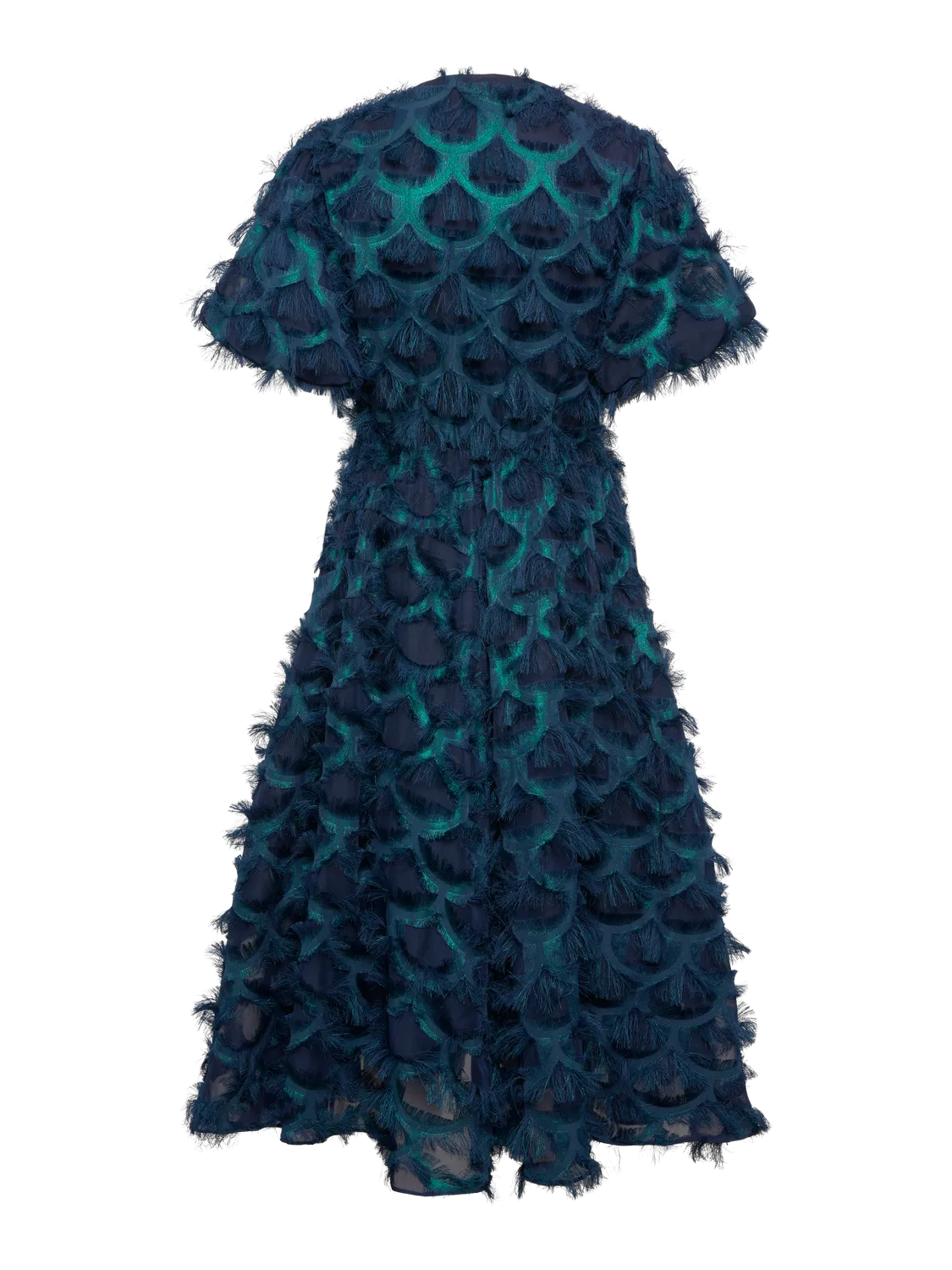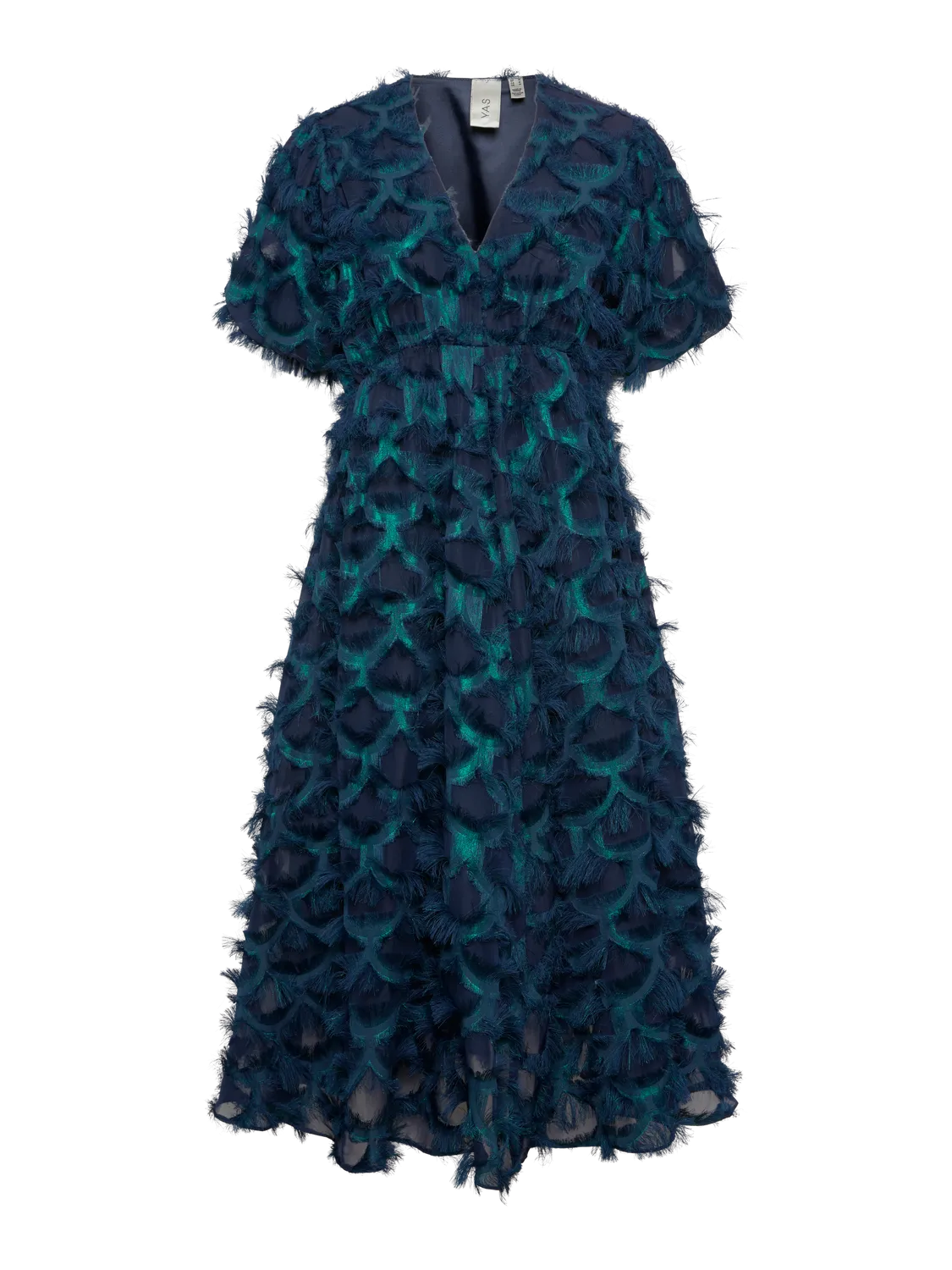 - Midi length occasion dress - All-over eyelash lace detail - V-neck - Puff sleeves - Cutline at waist - A-line skirt - Lined - Regular fit - Model is wearing size M