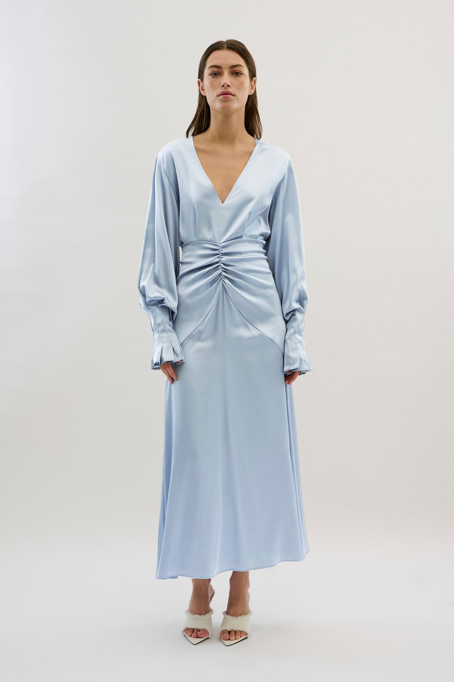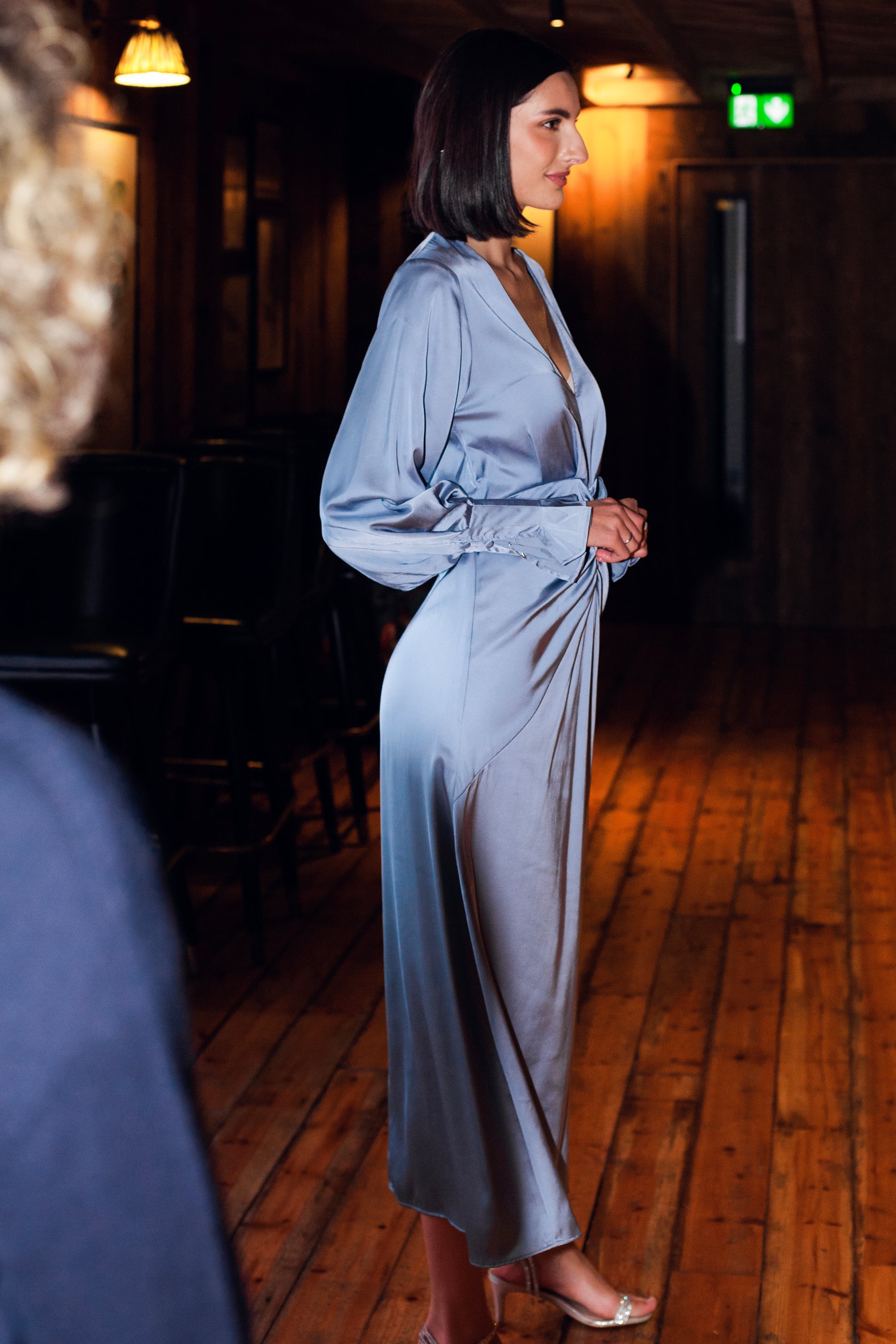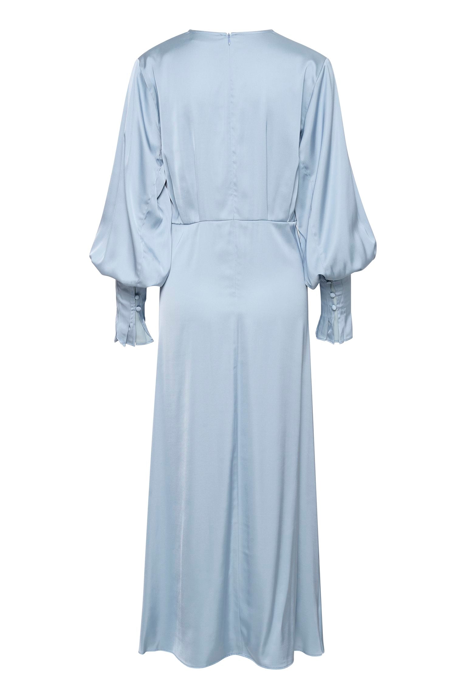 This dress offers a distinctive and artful appeal. A full-length garment with long sleeves, this feminine dress is made in a beautiful blue colour. Ideal for any occasion, it embodies classic simplicity without compromising on practicality.