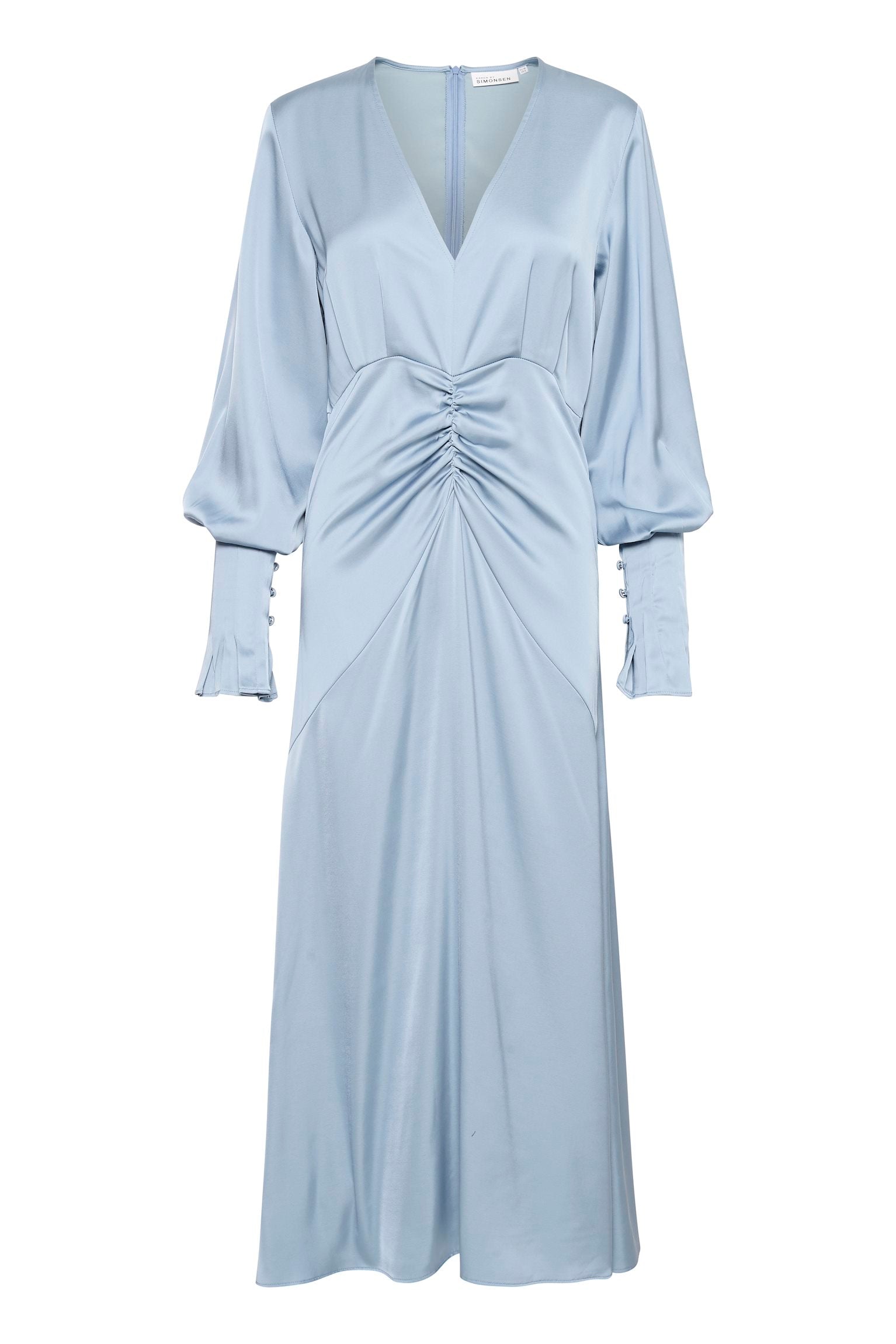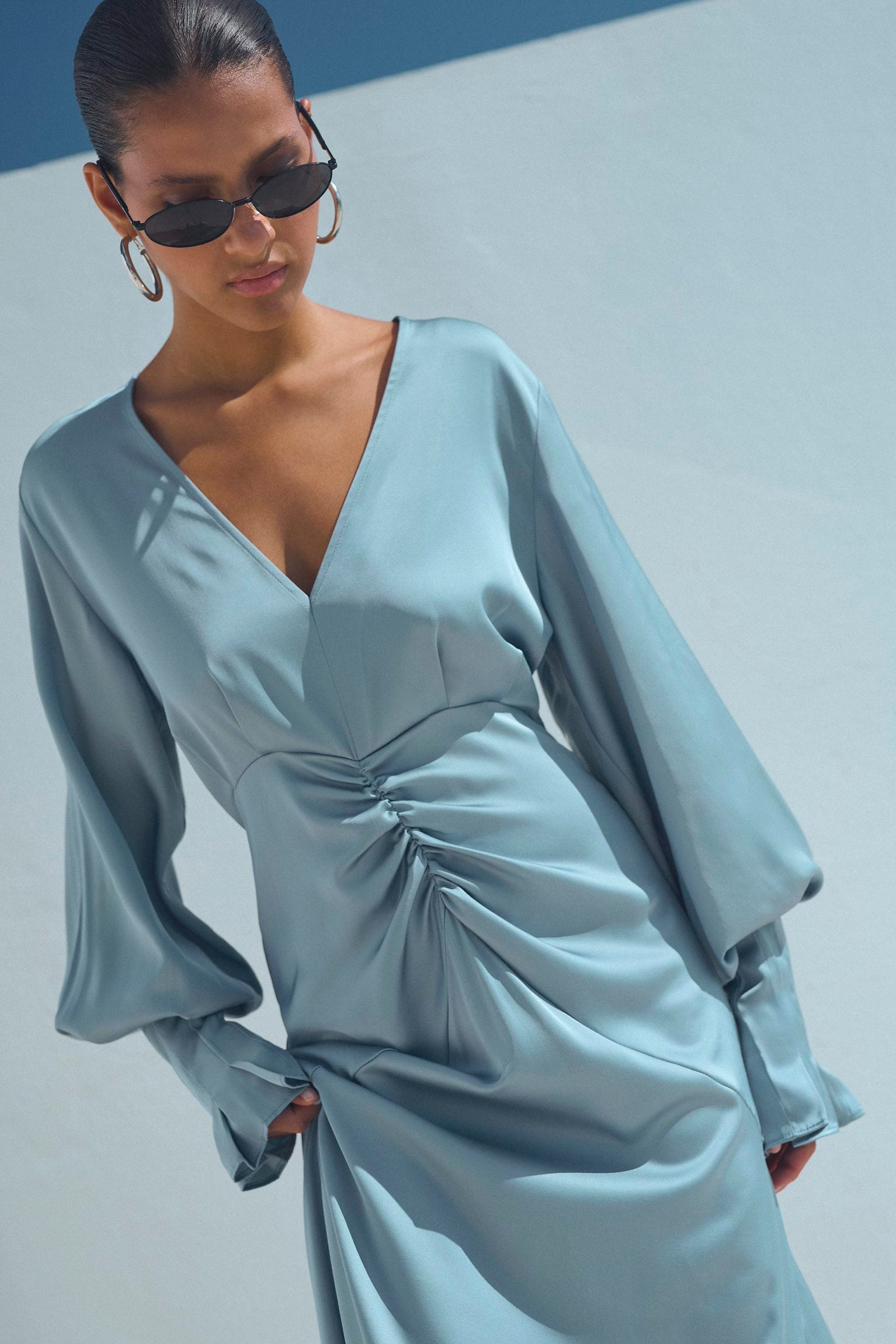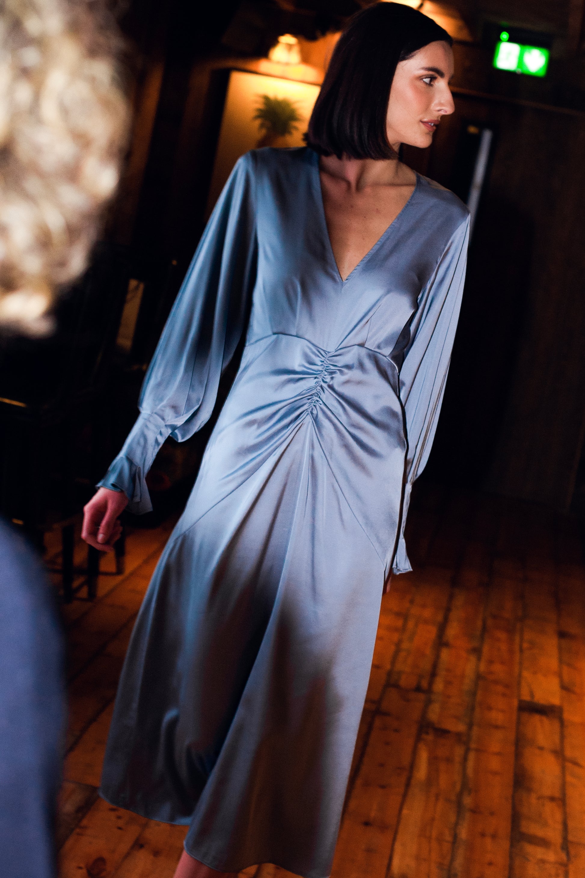 This dress offers a distinctive and artful appeal. A full-length garment with long sleeves, this feminine dress is made in a beautiful blue colour. Ideal for any occasion, it embodies classic simplicity without compromising on practicality.