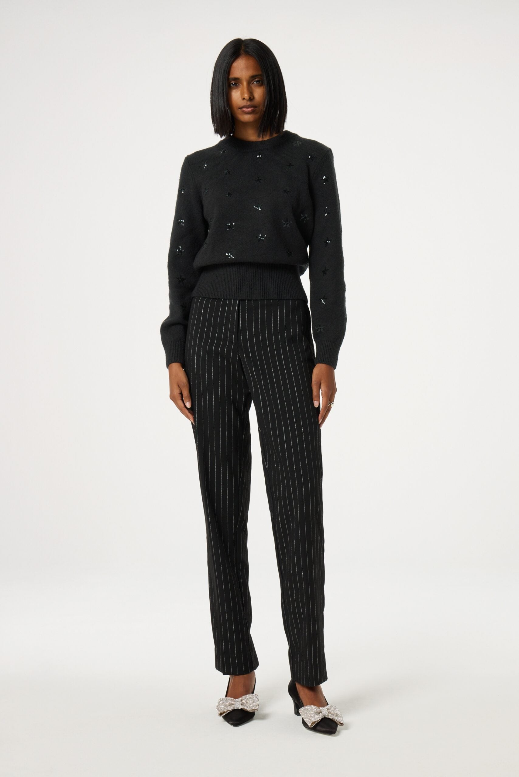 This women’s pullover features a round neck and all-over star print. Made from a blend of 52% Cotton, 24% Wool, 22% Polyester, and 2% Spandex, it offers a comfortable fit. Pair it with our Marie Straight Low-rise jeans for a casual yet stylish look.
