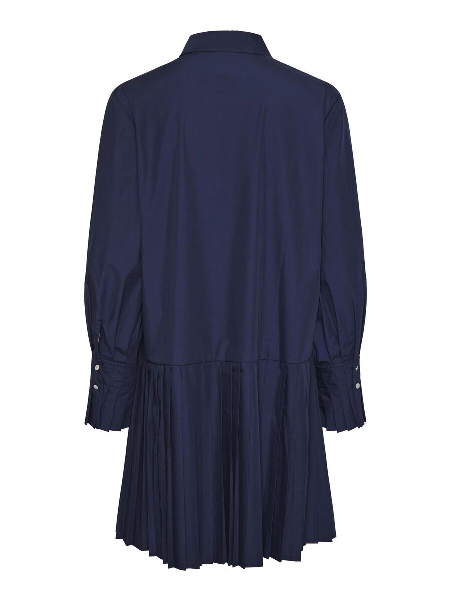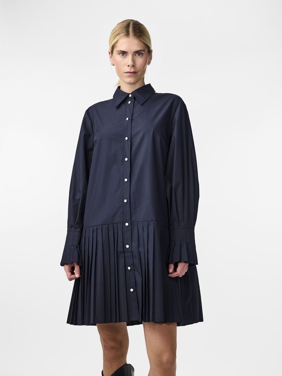 - Mini length shirt dress - Pointed collar - Dropped shoulders - Long voluminous sleeves with oversized cuffs - Button-up front - Dropped waist - Pleated hem - Loose fit - Model is wearing size M