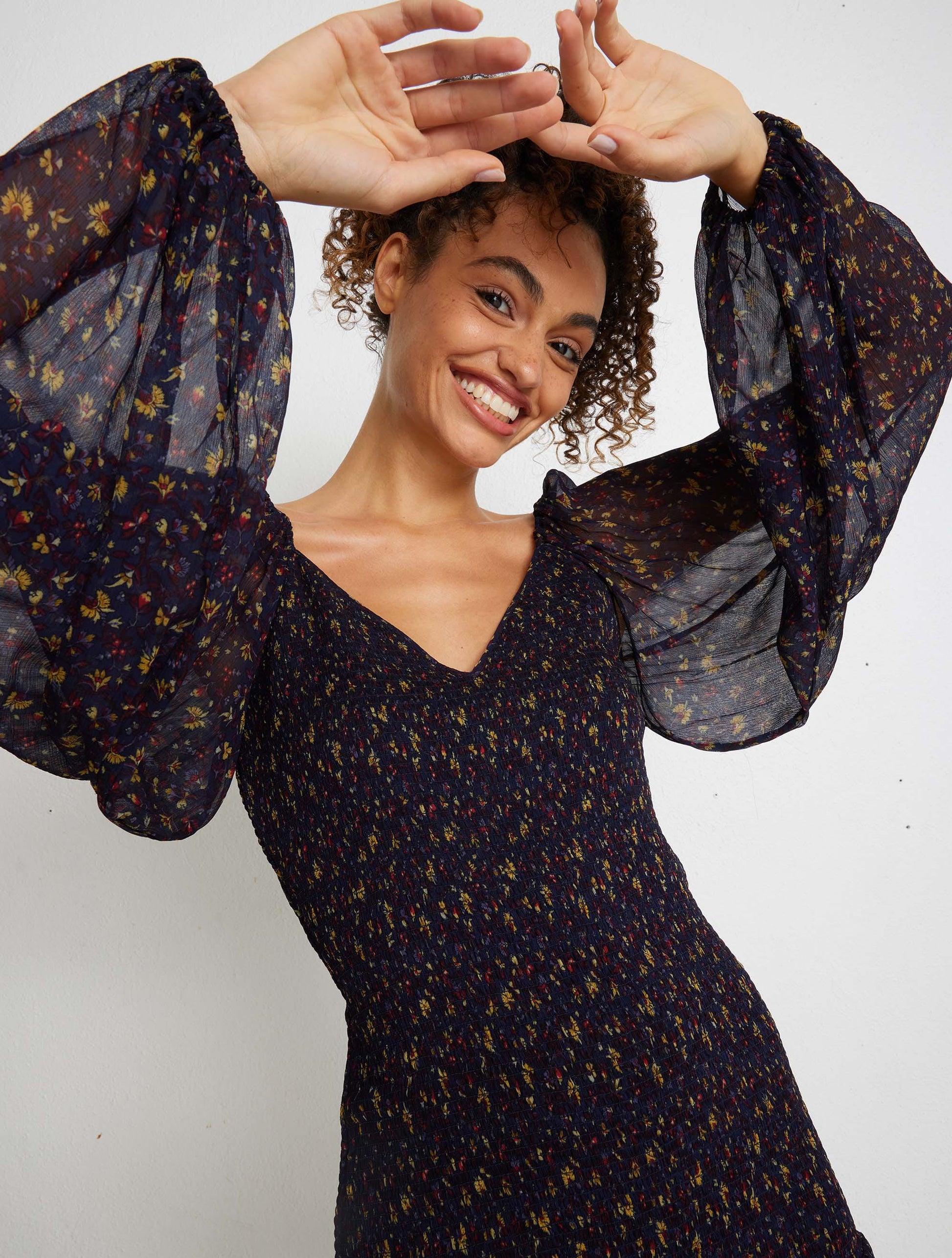 Beautiful short dress with smocking across body and sheer balloon sleeves.