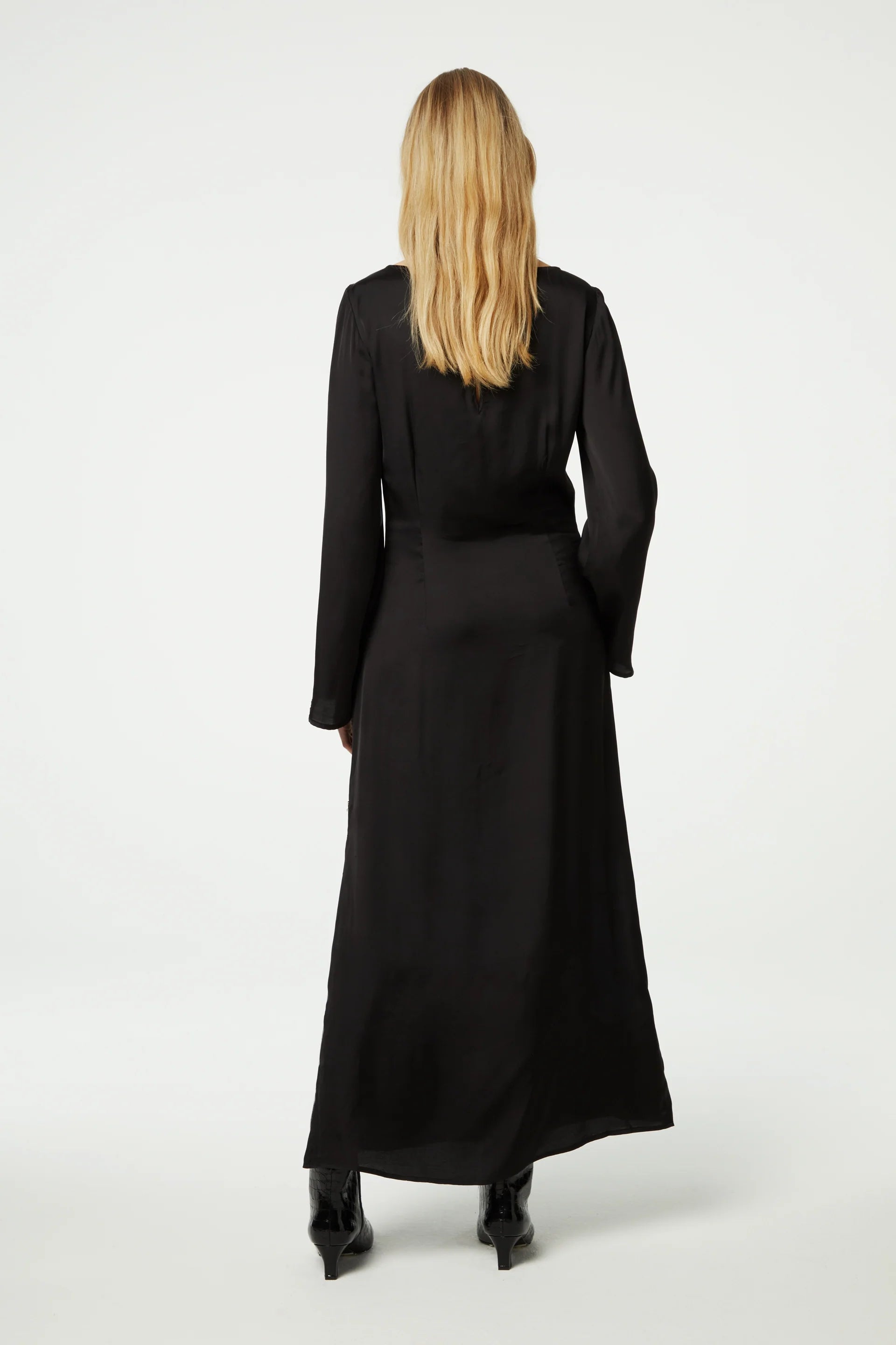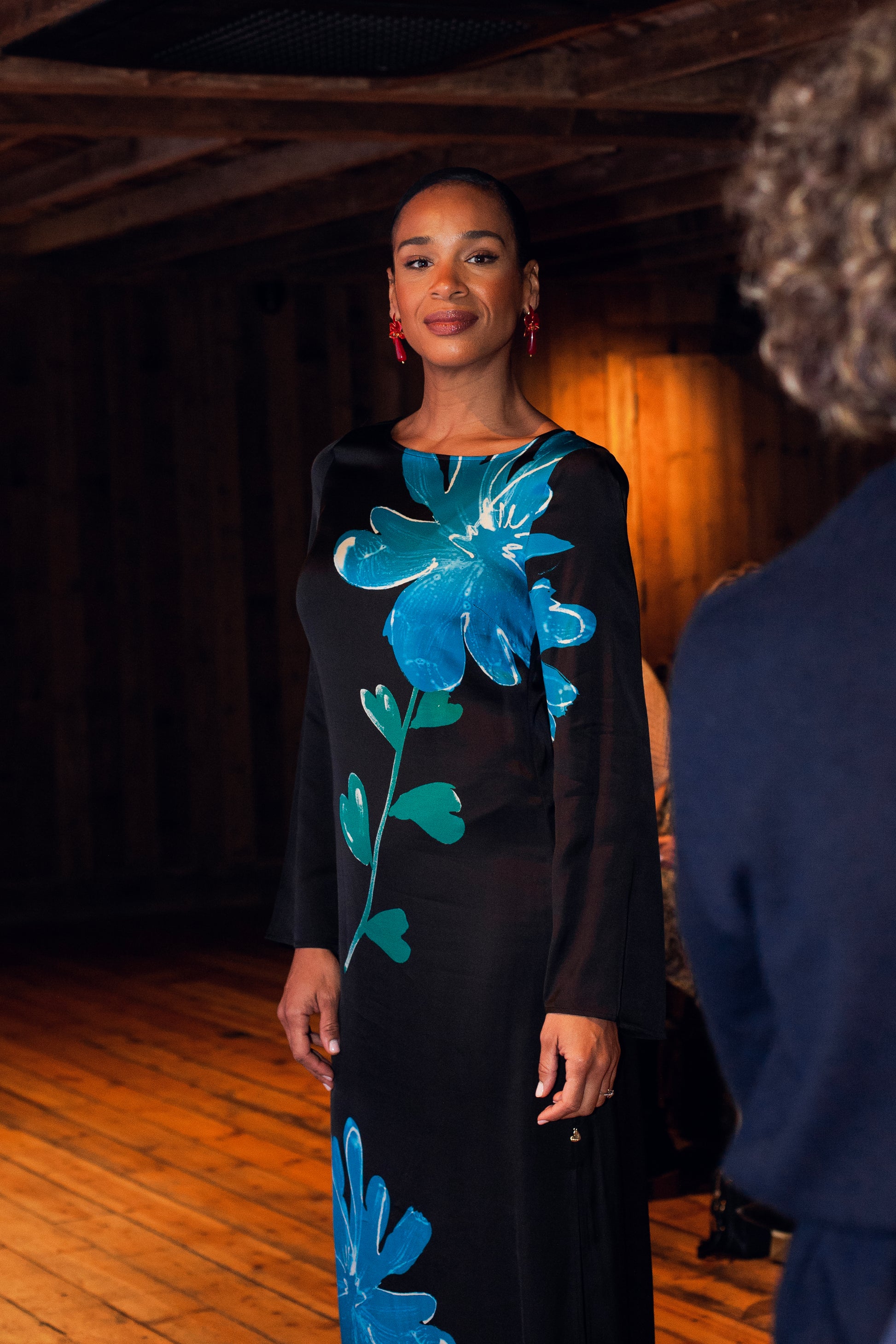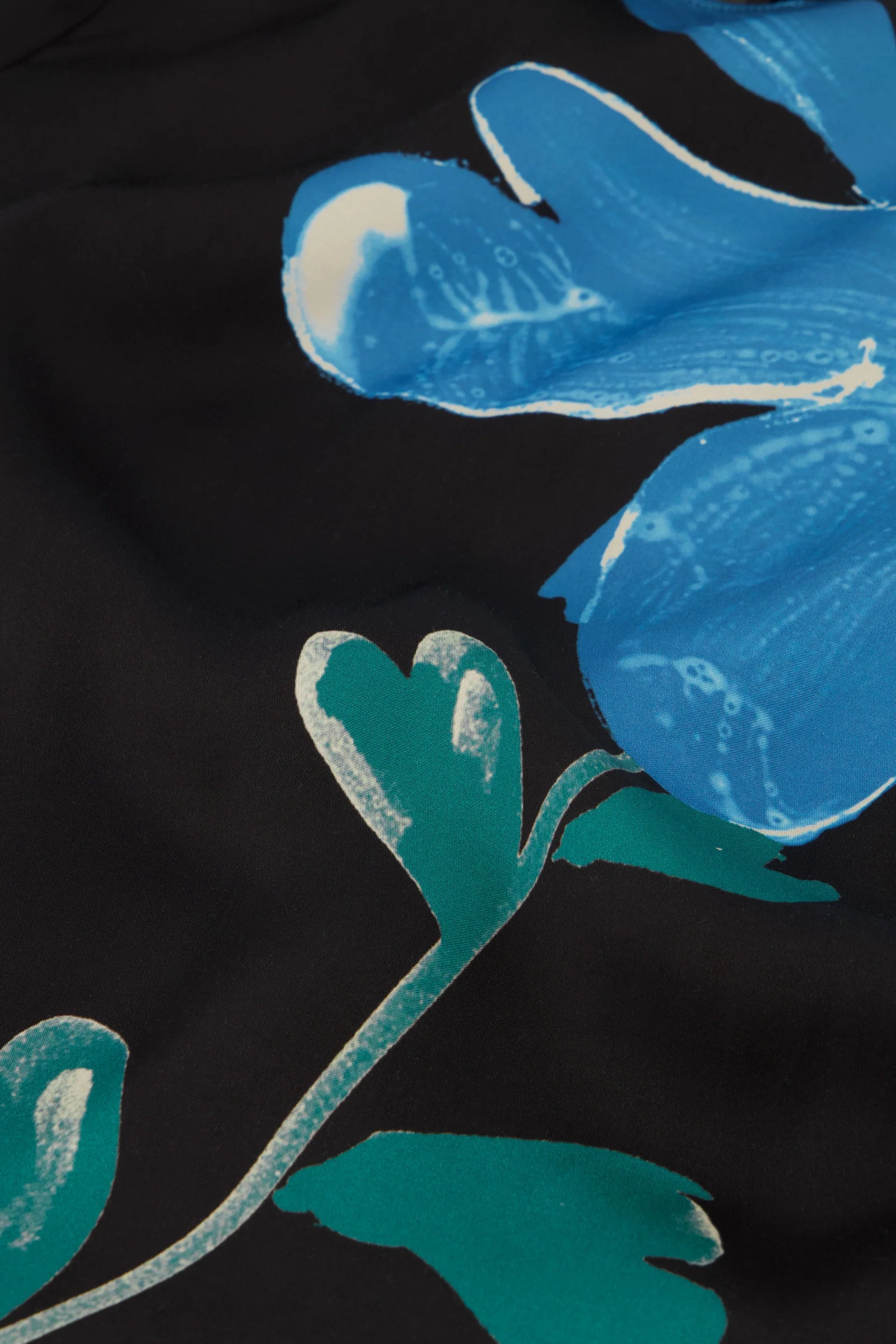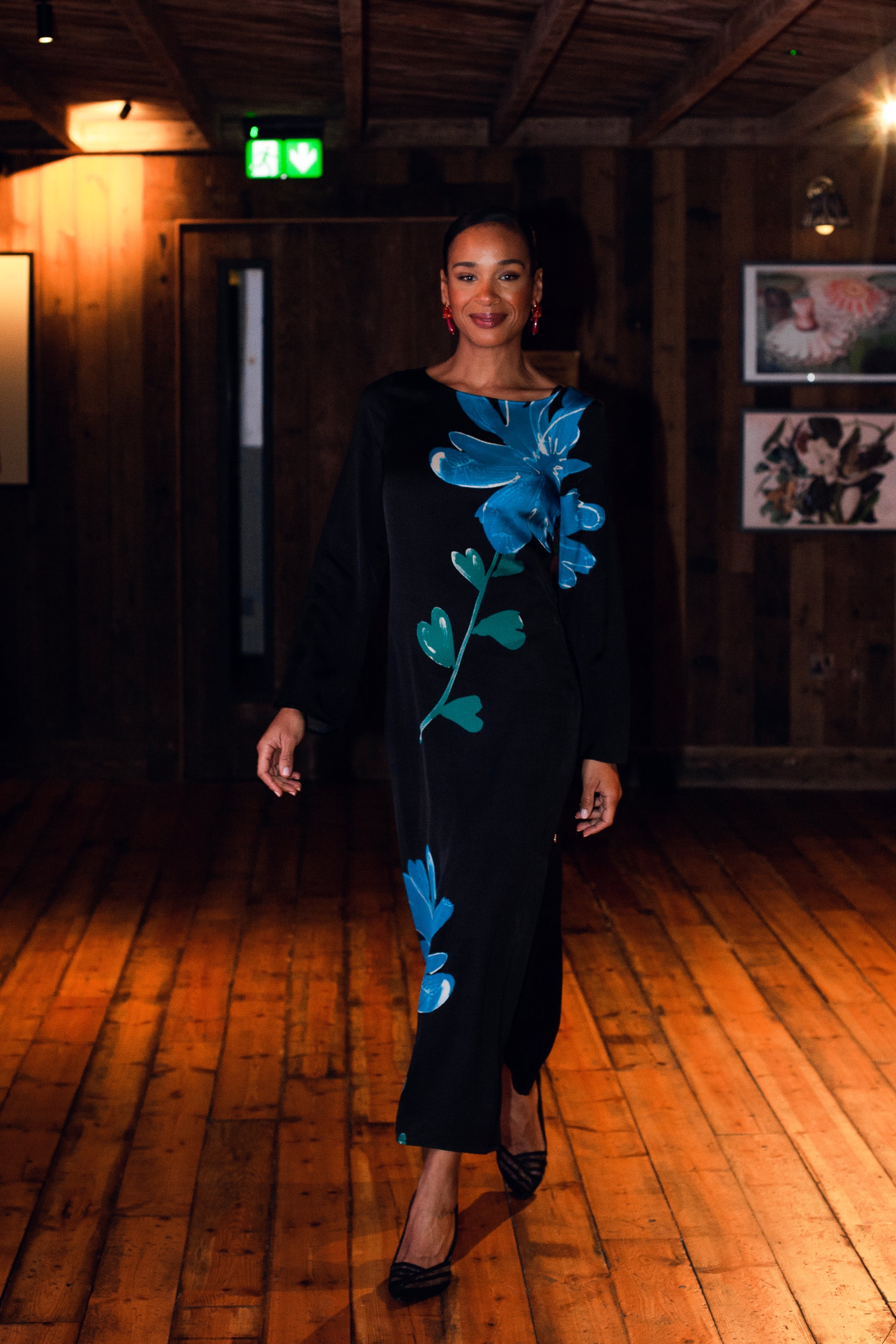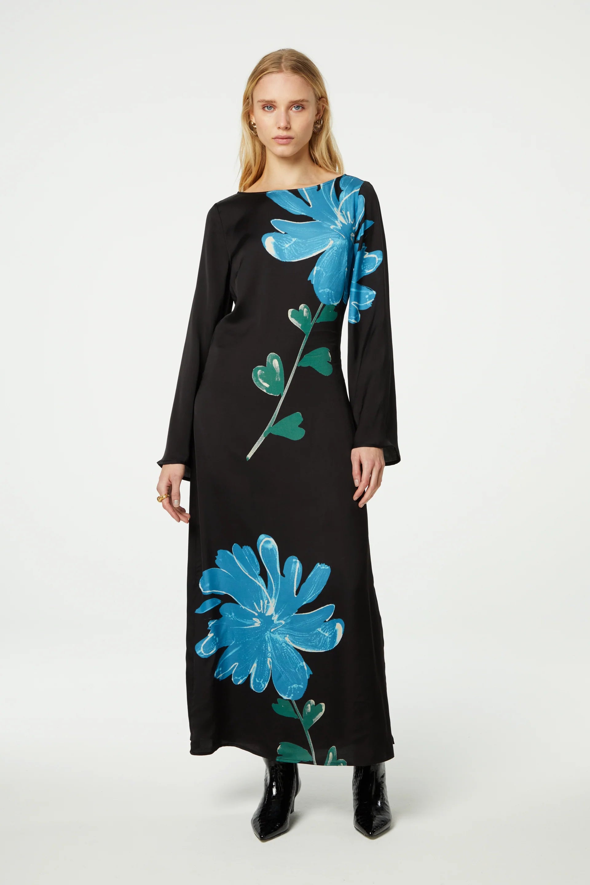 This women's midi-length dress in black with a blue floral print features an elegant and feminine design, long flared sleeves, and a round neckline. Made from 50% Viscose (LENZING™ ECOVERO™) and 50% Viscose, it is an elegant staple that adds a feminine touch to your wardrobe.