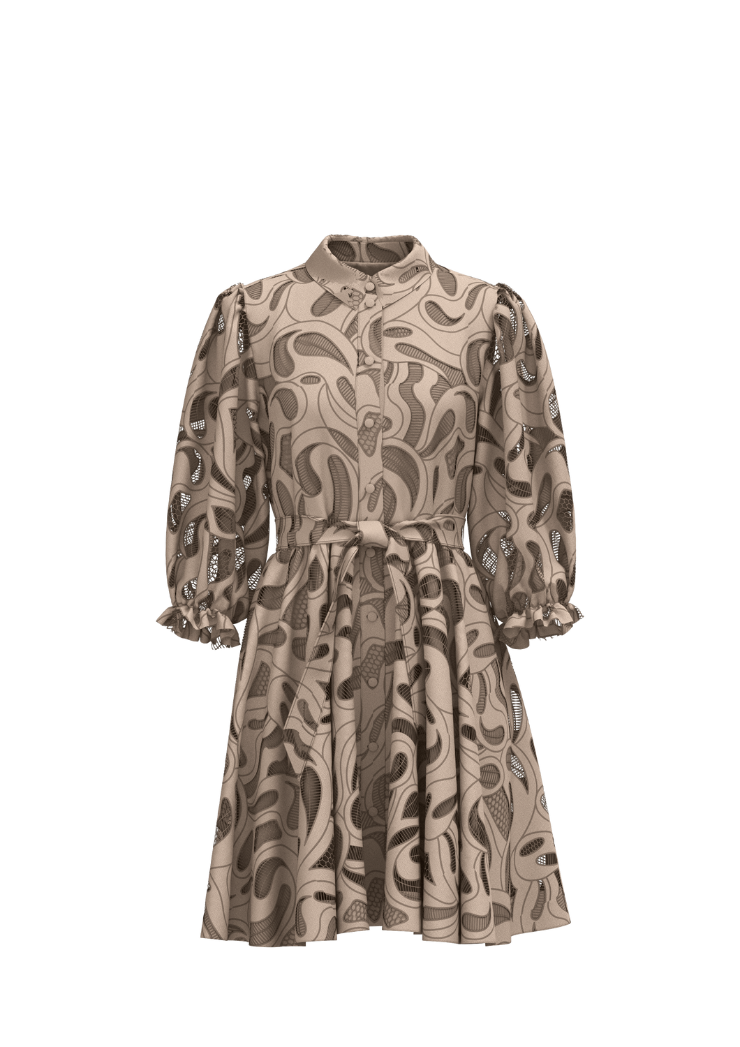 - Product Type : Dress - Neck : Shirt Collar - Sleeve : 3/4 Sleeves (3/4) - Cuffs : Elasticated cuffs - Closing : Button fastening - Length/Size : Short - Extra details : Belt included, Cutline at waist - Fit : Regular Fit