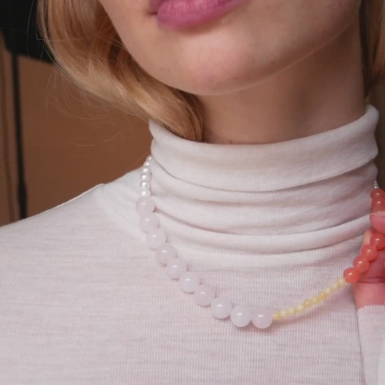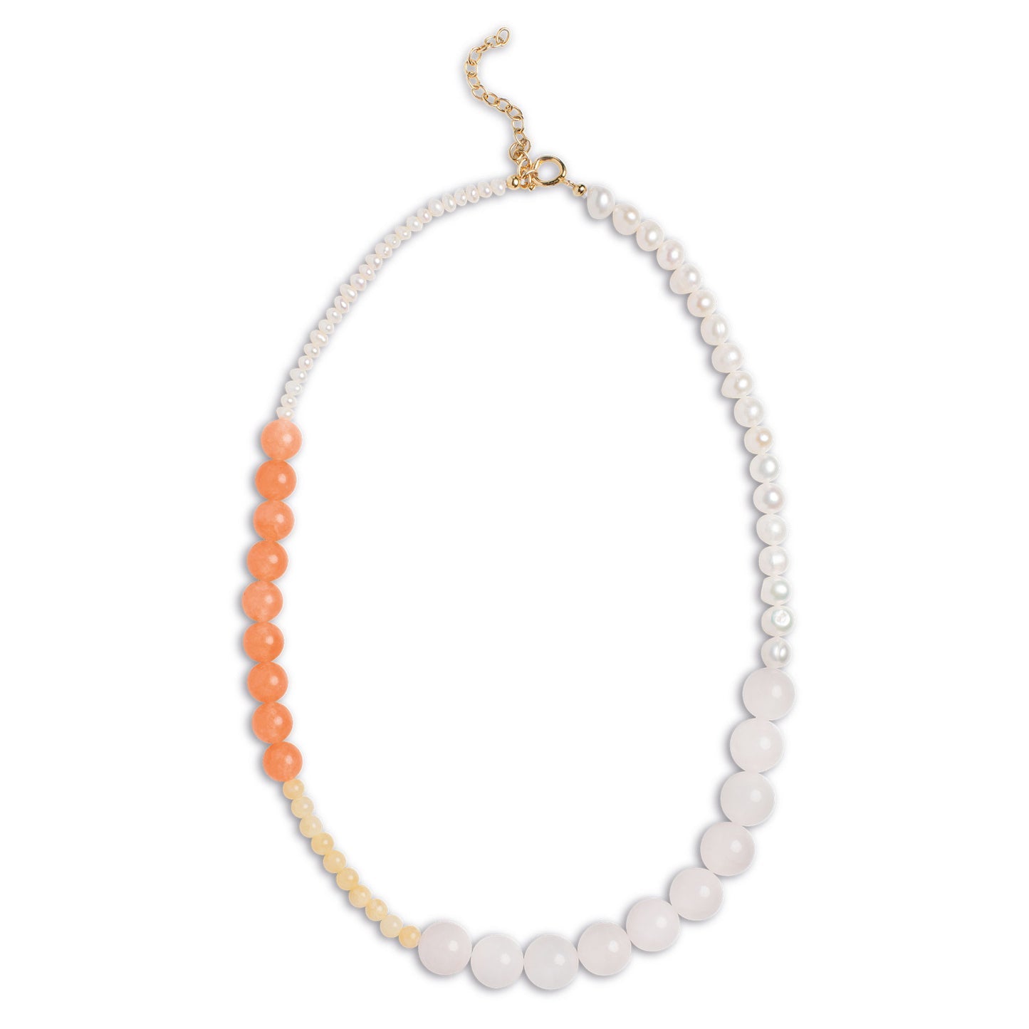 The Tahlia necklace consists of sweet and feminine colors. It has stones and pearls in a variety of shapes and sizes, creating a playful necklace in delightful tones. Discover your favorite among our collection of colorful stone necklaces. The stones are natural, so they may vary in shade and expression.