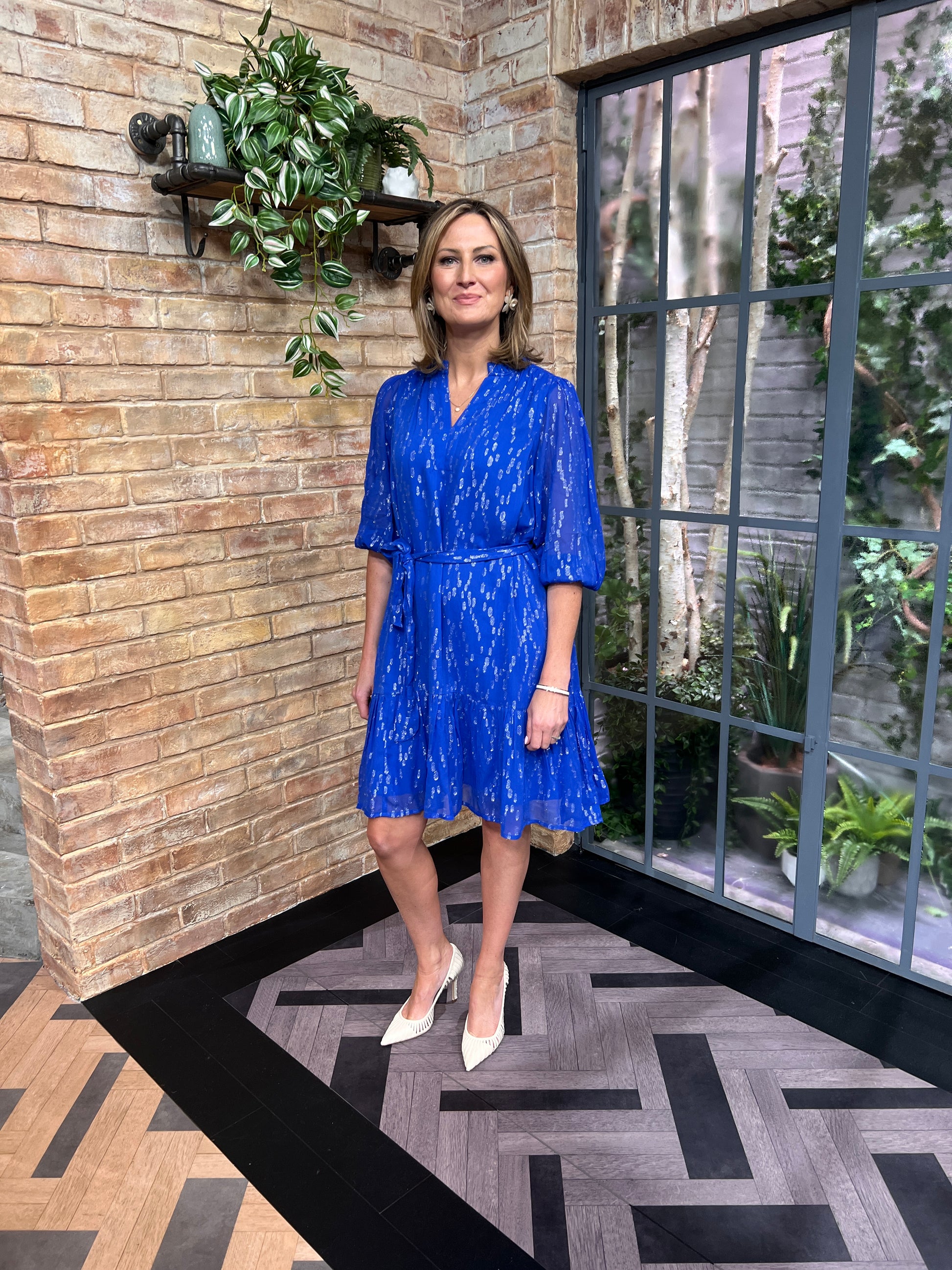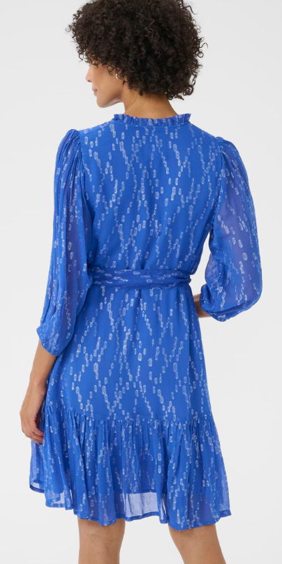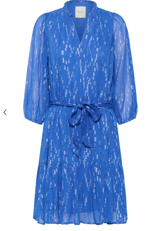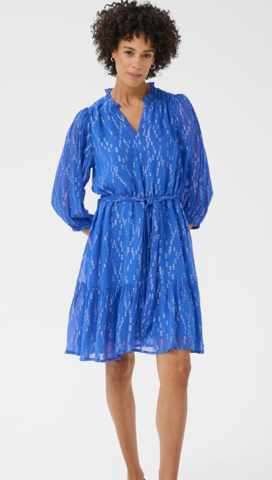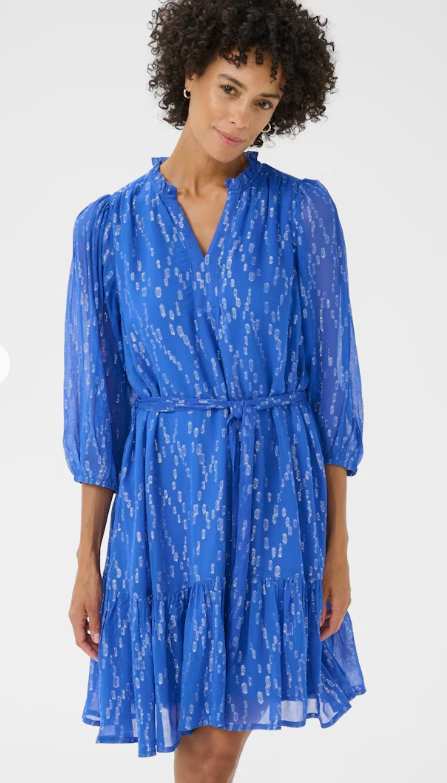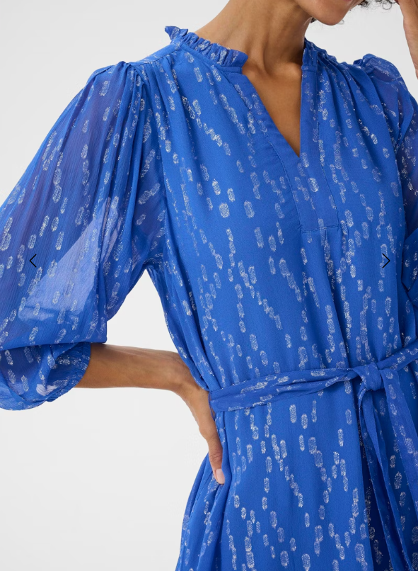 The model is 177 cm tall and wears a size 36. This knee-length dress in a vibrant blue hue features a semi-sheer outer layer with a subtle shimmer effect. With a tie waist and three-quarter sleeves, it creates a feminine silhouette that’s both comfortable and elegant. Perfect for both everyday wear and special occasions.