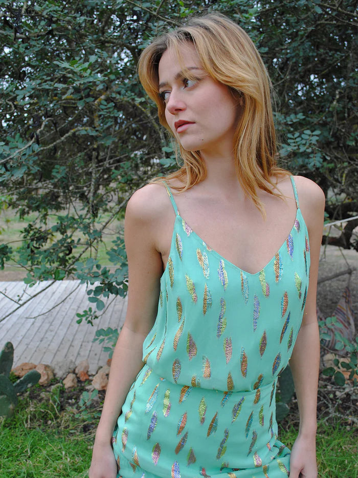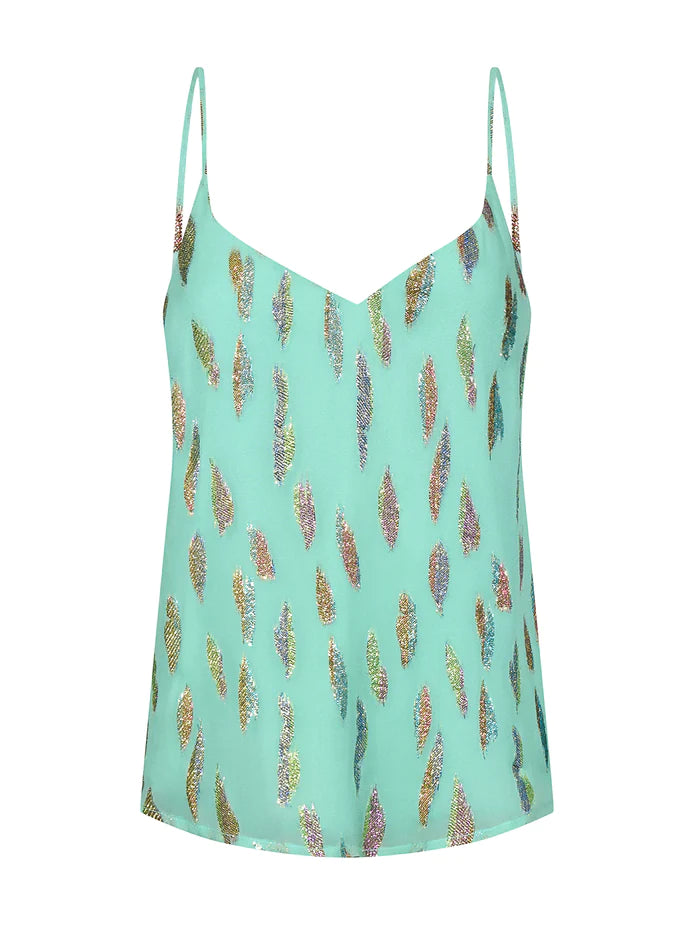 The V Cami is a simple V neck camisole - elegant, fluid and a perfect layering addition to your wardrobe. With a relaxed fit and adjustable spaghetti straps. In a vibrant sheer green chiffon, decorated with a rainbow feather pattern. Satin lined. Pairs perfectly with the matching Flora skirt or white linen.