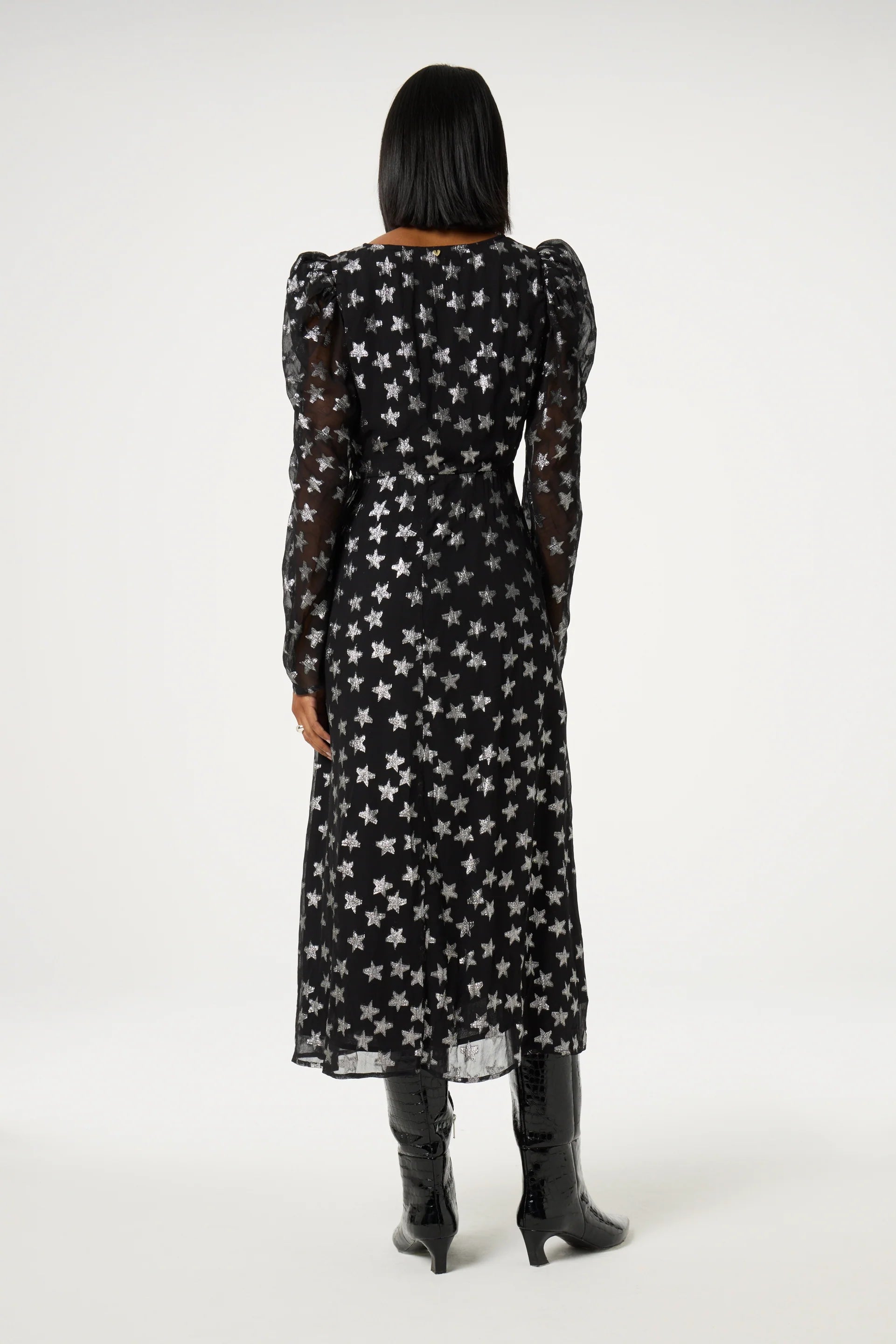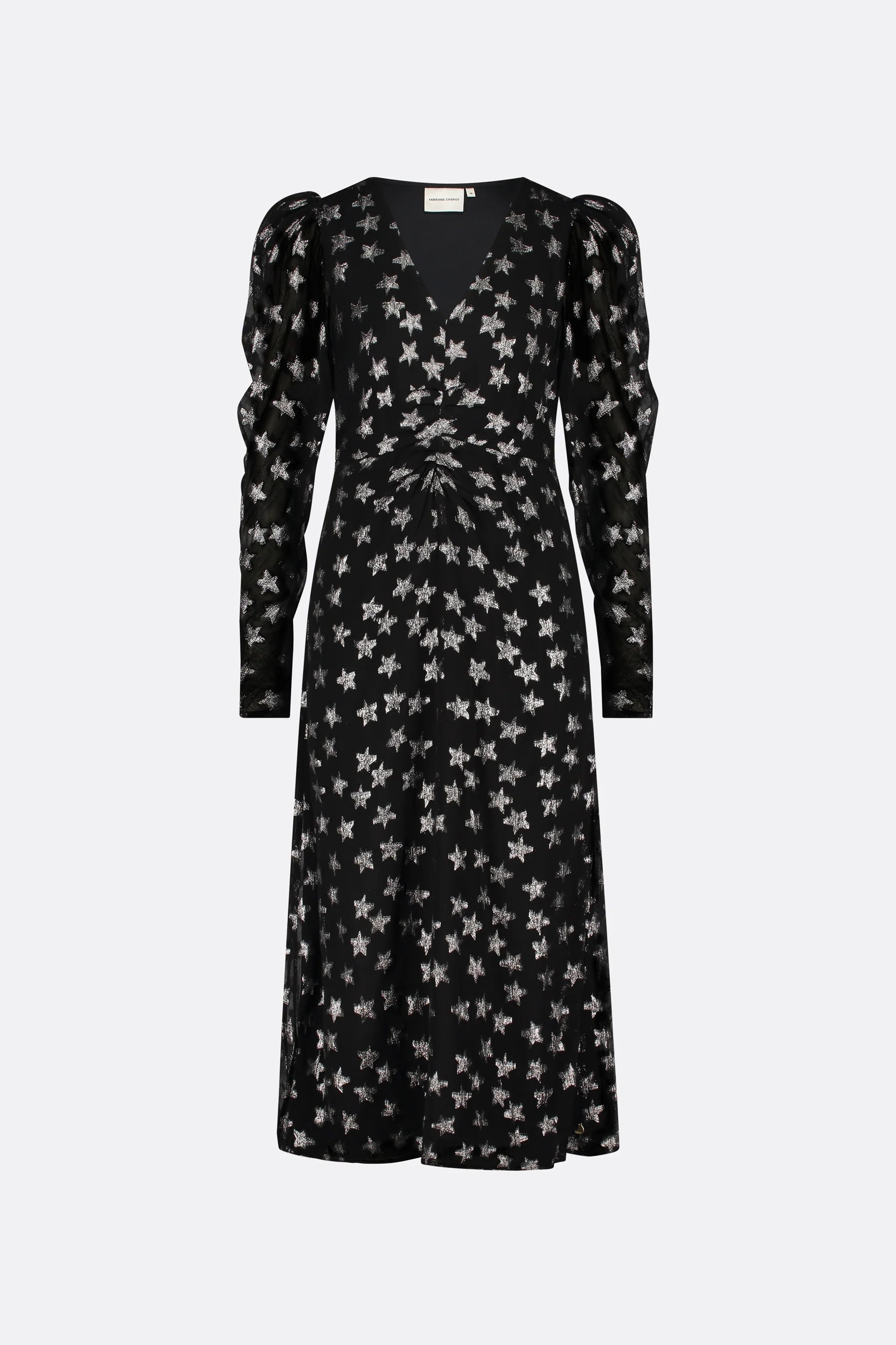 This midi women's dress in black, features long sleeves, an elasticated waist and cuffs and an all-over print of silver-coloured stars, adding a feminine touch to your look.