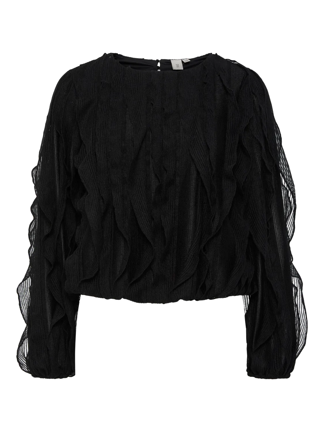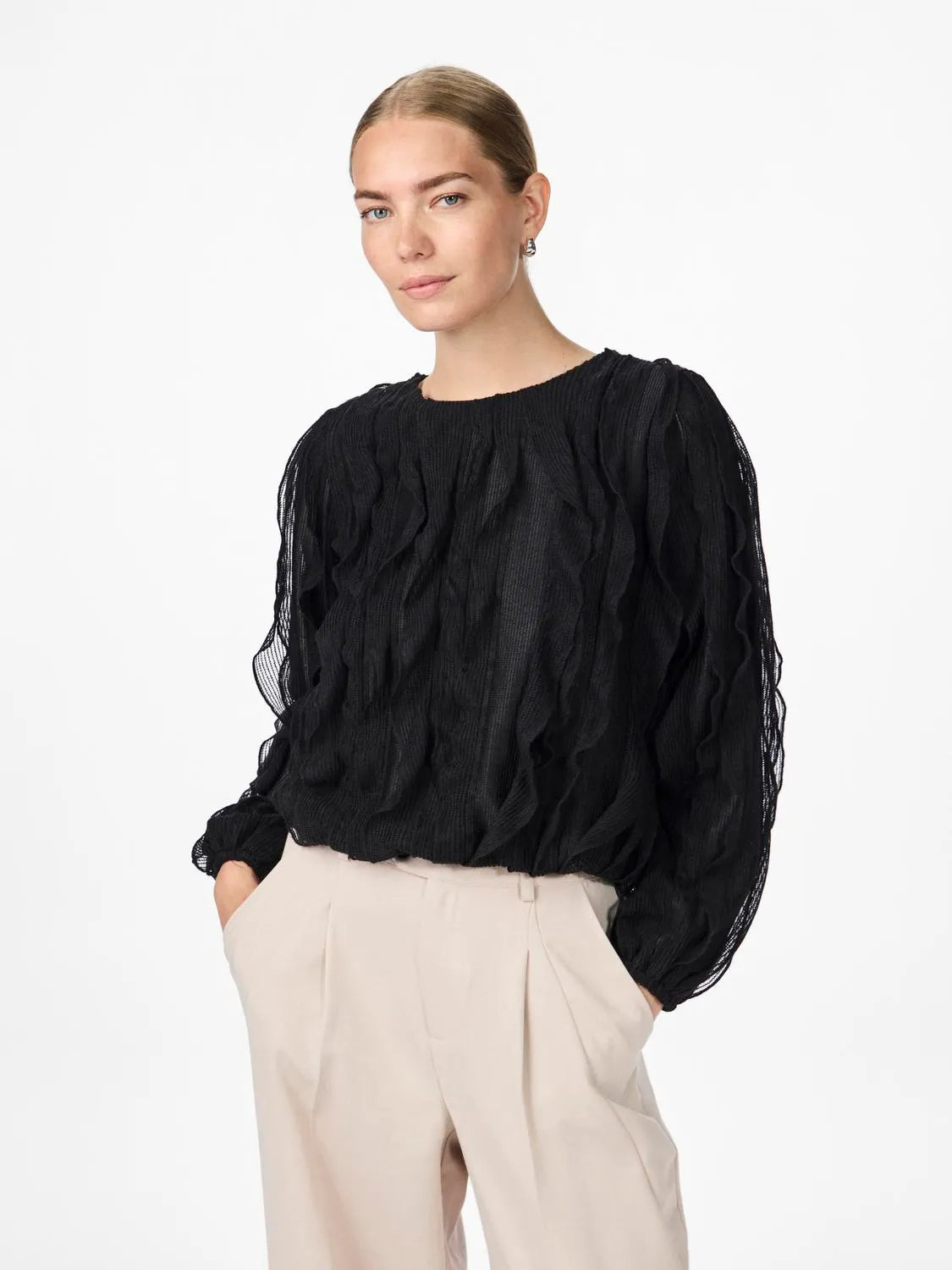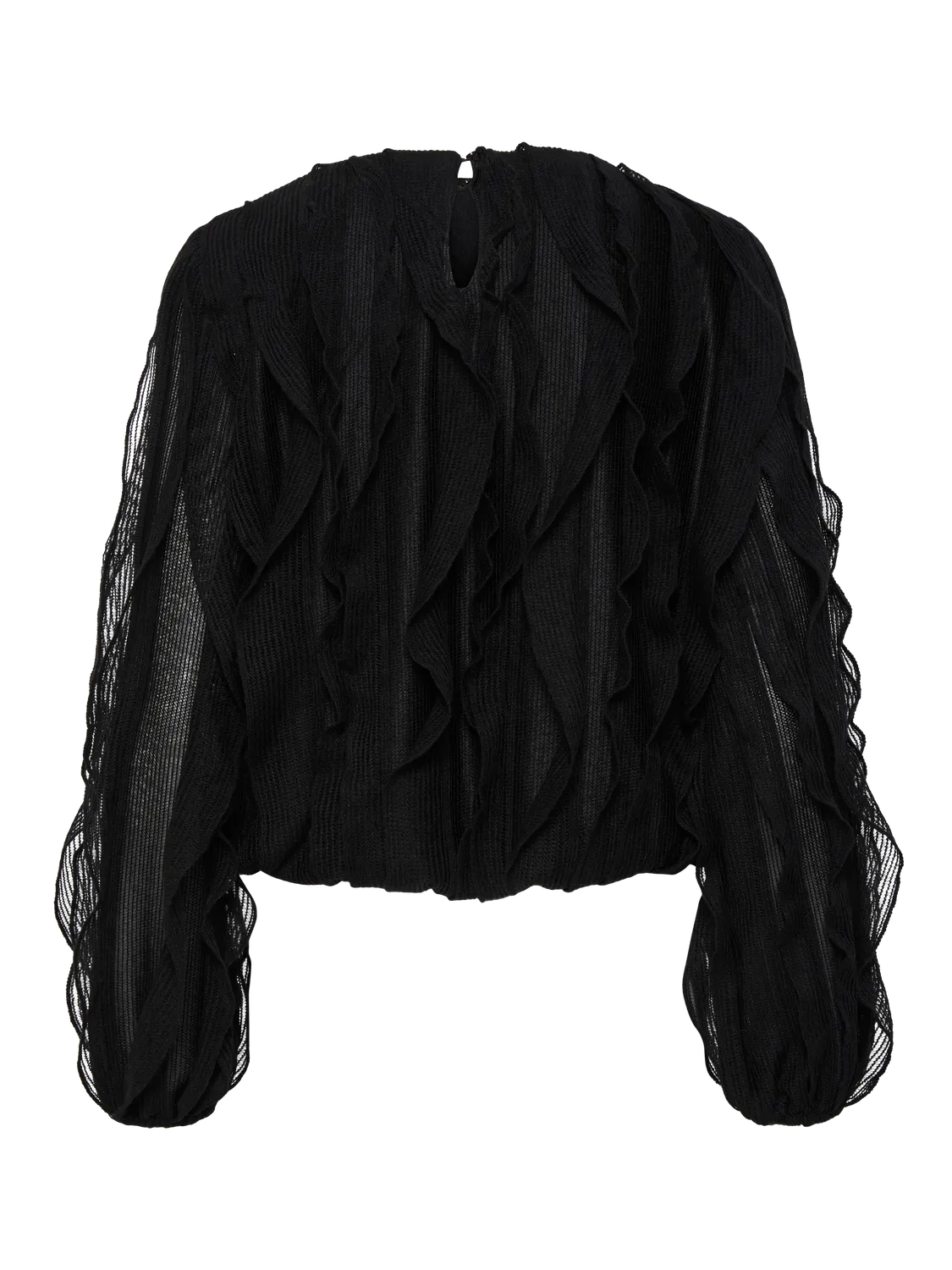 - Blouse with semi-sheer frilled detail - Round neck - Keyhole back button fastening - Long voluminous sleeves - Elasticated cuffs - Regular fit - Model is wearing size M