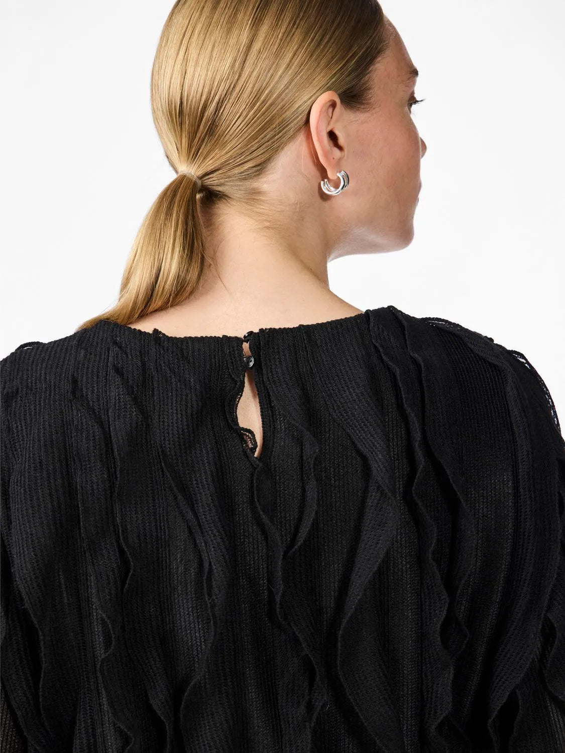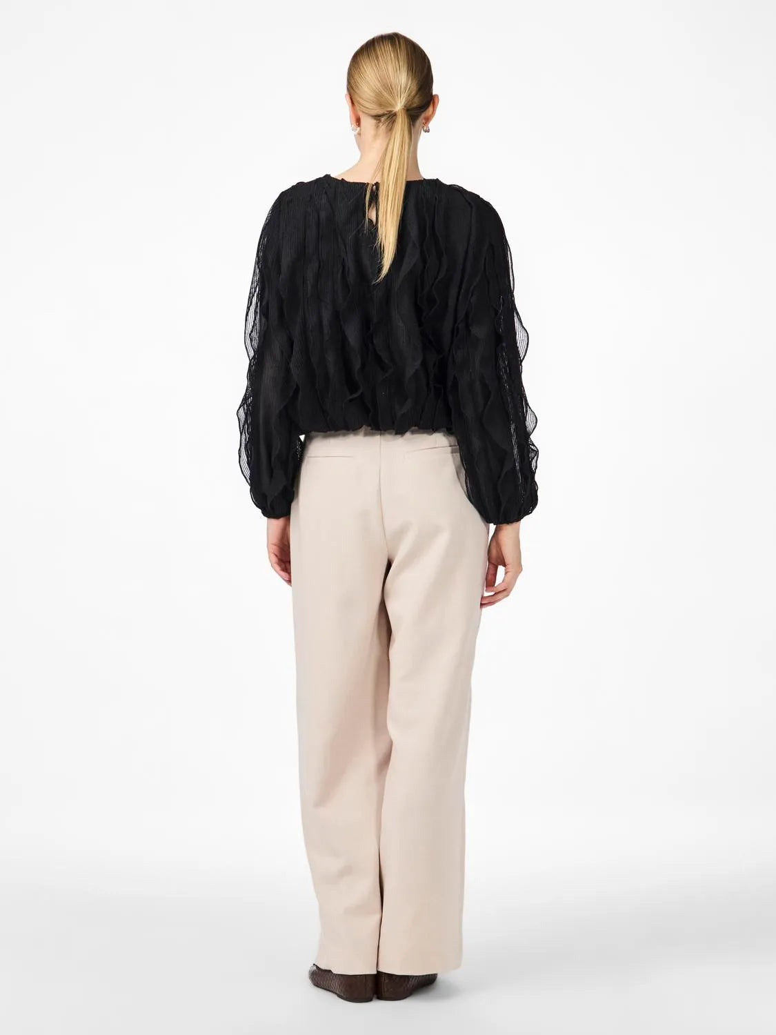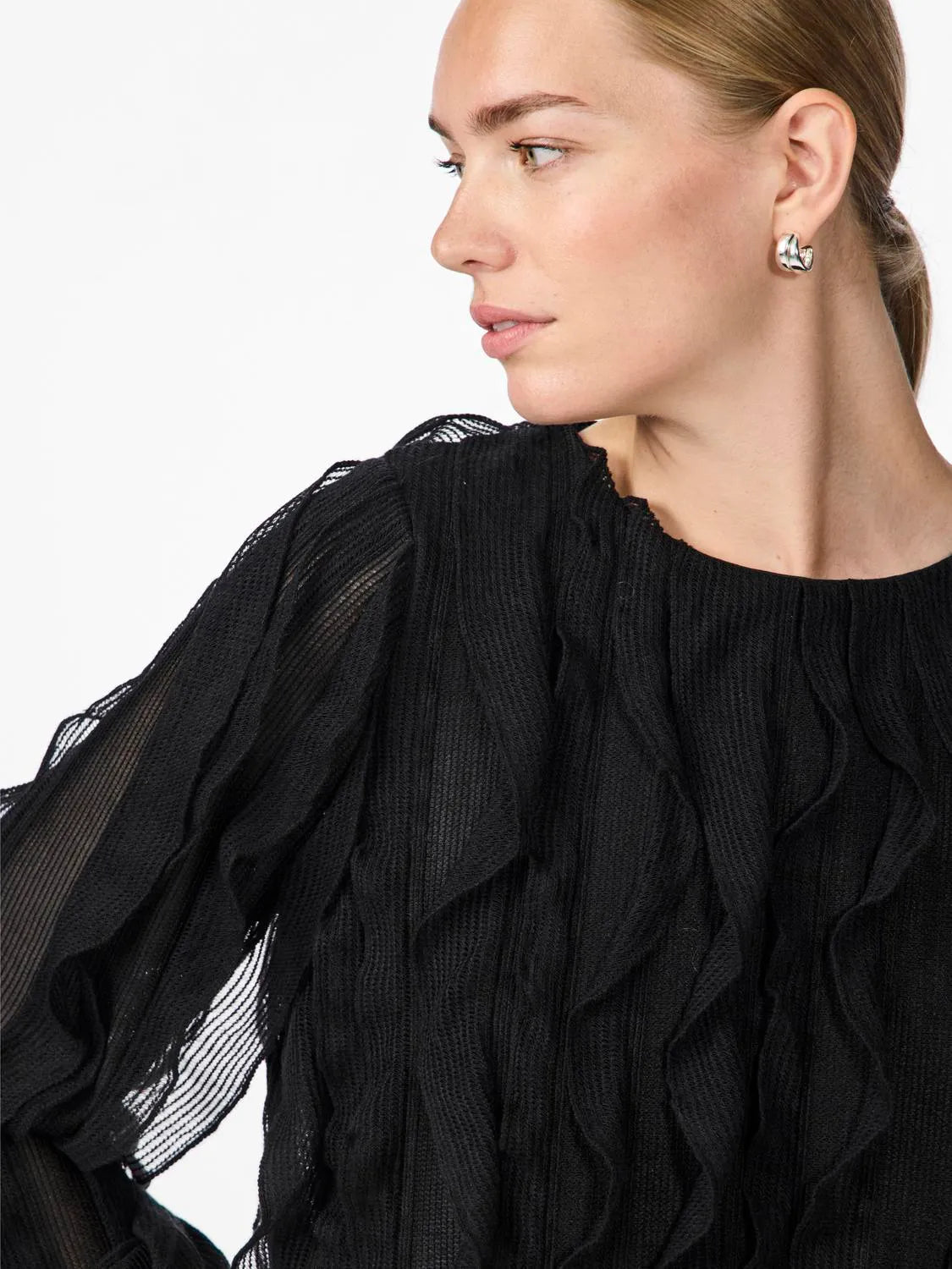 - Blouse with semi-sheer frilled detail - Round neck - Keyhole back button fastening - Long voluminous sleeves - Elasticated cuffs - Regular fit - Model is wearing size M